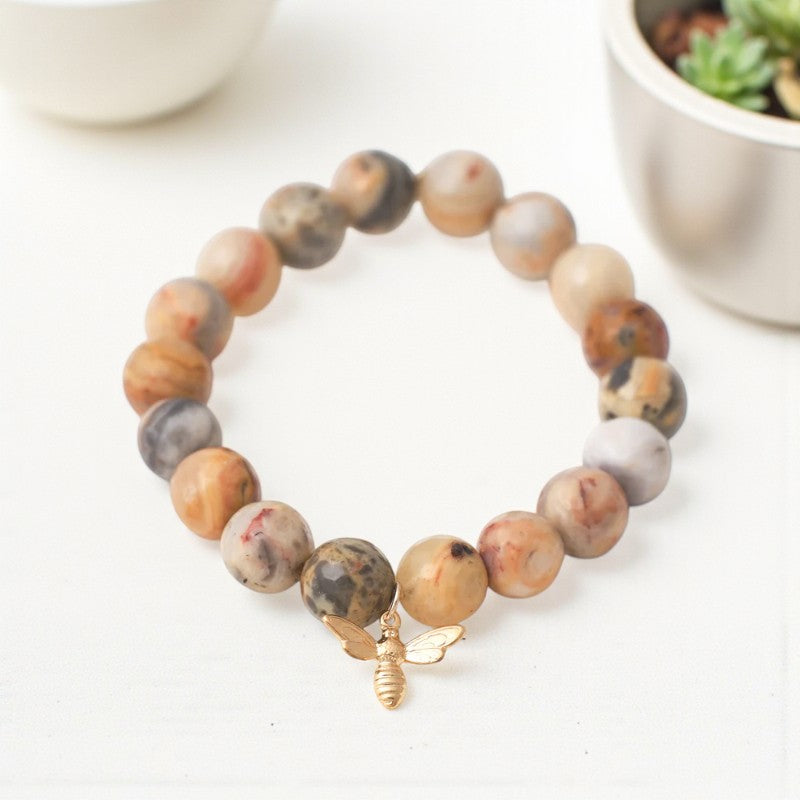 This stunning bracelet, strung on a strong clear elastic cord and adorned with a natural gold Infinite Warrior charm, resonates with the energies of the May birthstone and aligns with the zodiac signs of Gemini and Virgo.