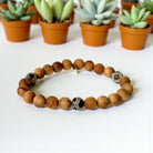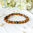 Discover a path to love, abundance, and inner harmony with the exquisite 8mm sandalwood bracelet adorned with three brown giraffe agate beads and a natural gold Infinite Warrior charm. This bracelet, expertly strung on a strong clear elastic cord, resonates with the energies of the May birthstone and harmonizes with the zodiac signs of Gemini and Virgo.