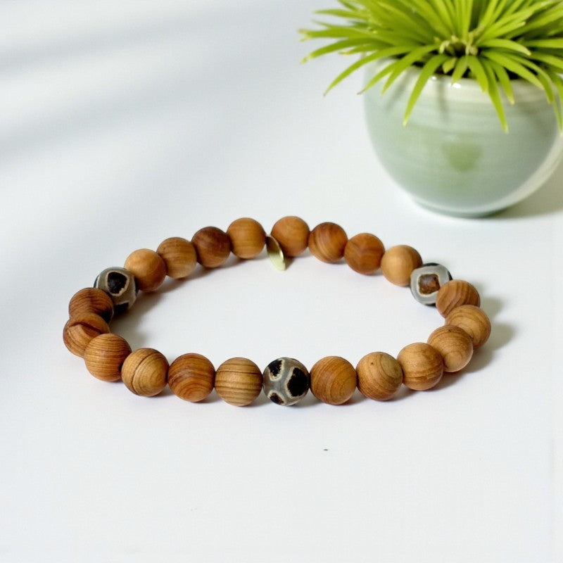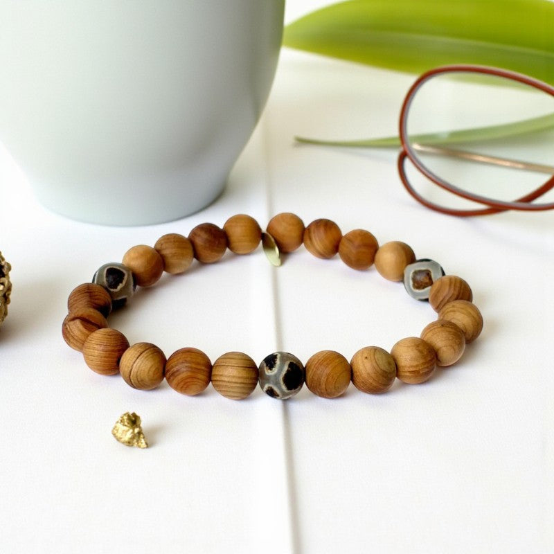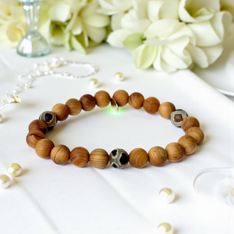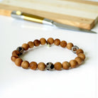 Sandalwood, known for its calming and grounding properties, complements the soothing energies of brown giraffe agate to create a harmonious blend of healing virtues. This captivating bracelet not only reduces headaches and anxious thoughts but also enhances concentration, gut health, and emotional equilibrium. By wearing this bracelet, you can find solace from inner anger and tension, while benefiting from its aura-stabilizing and cleansing effects.