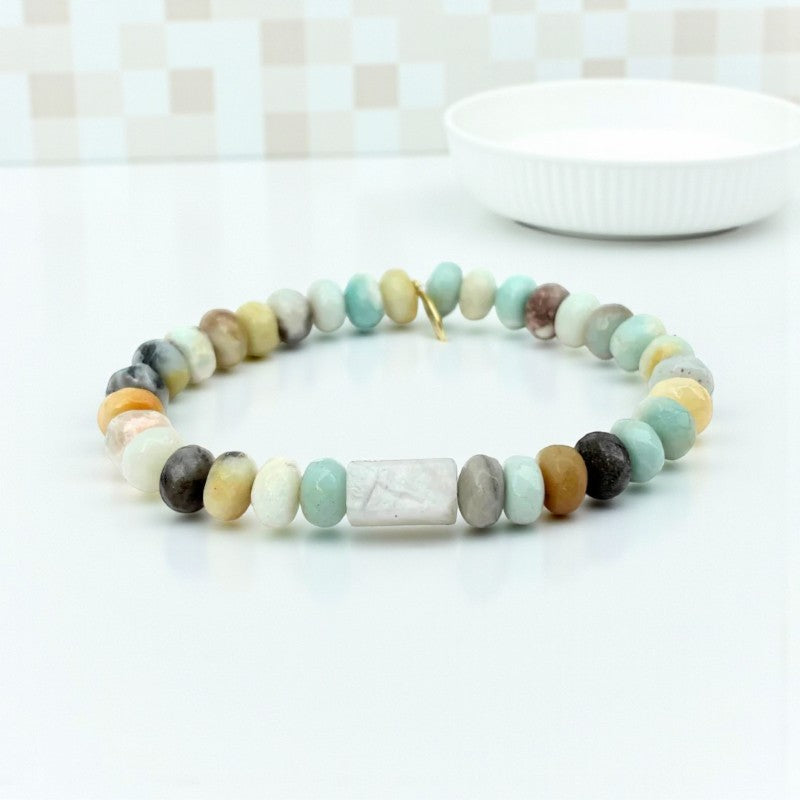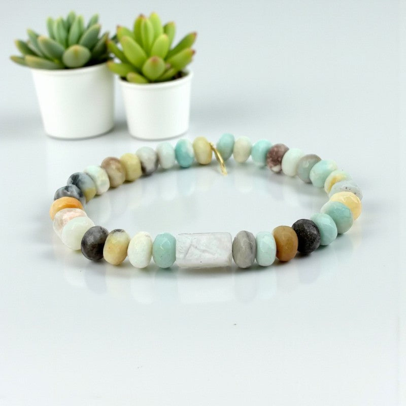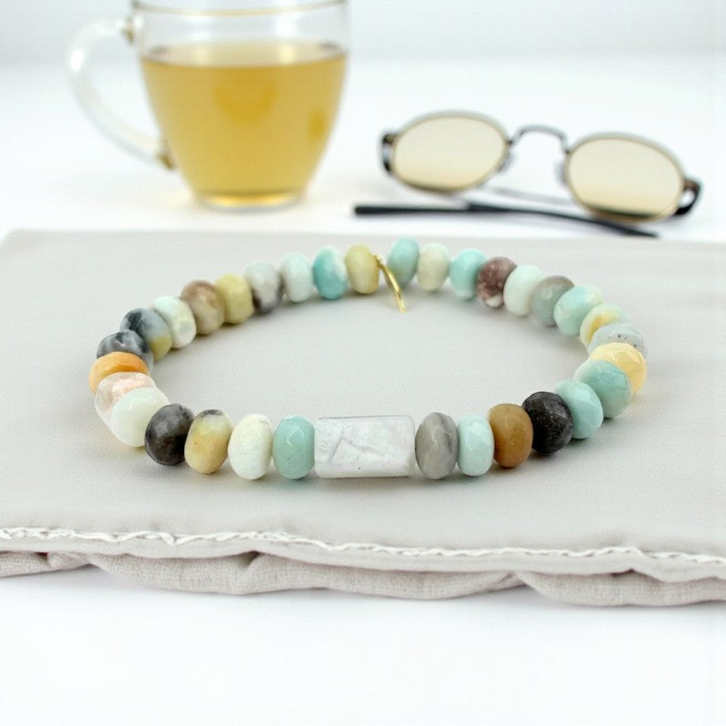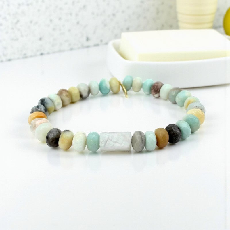To maintain the vitality of your bracelet, remember to recharge it every couple of weeks by basking it in the gentle glow of sunlight and moonlight for 24 hours. Treat your bracelet with care, wearing it daily or keeping it close while you sleep to benefit from its healing properties. Allow the Amazonite and moonstone bracelet to guide you towards a path of tranquility, self-empowerment, and emotional well-being, as you navigate life's challenges with grace and resilience.
