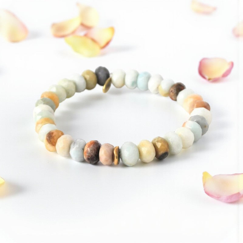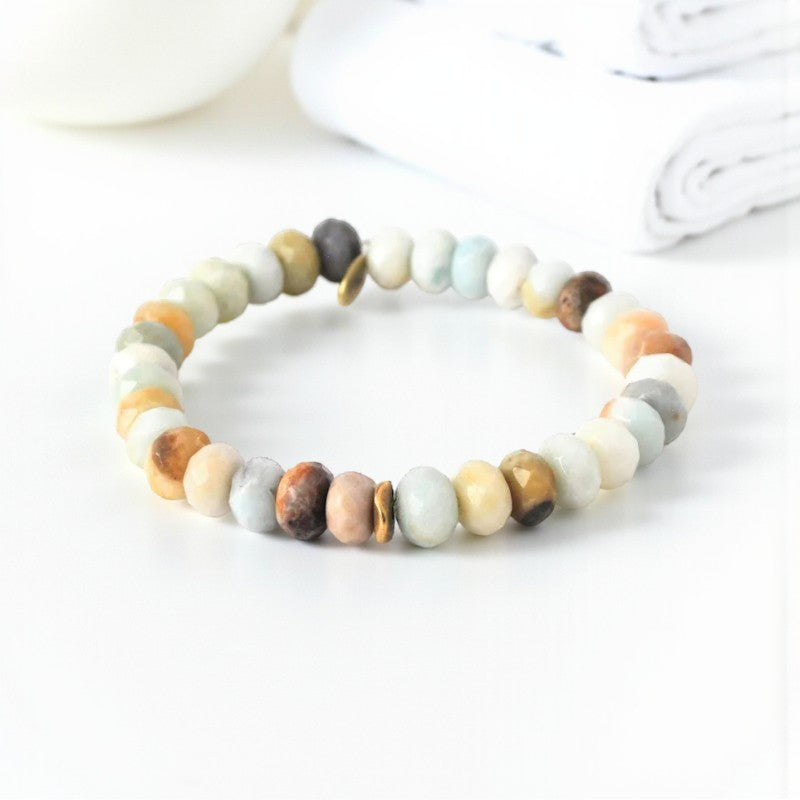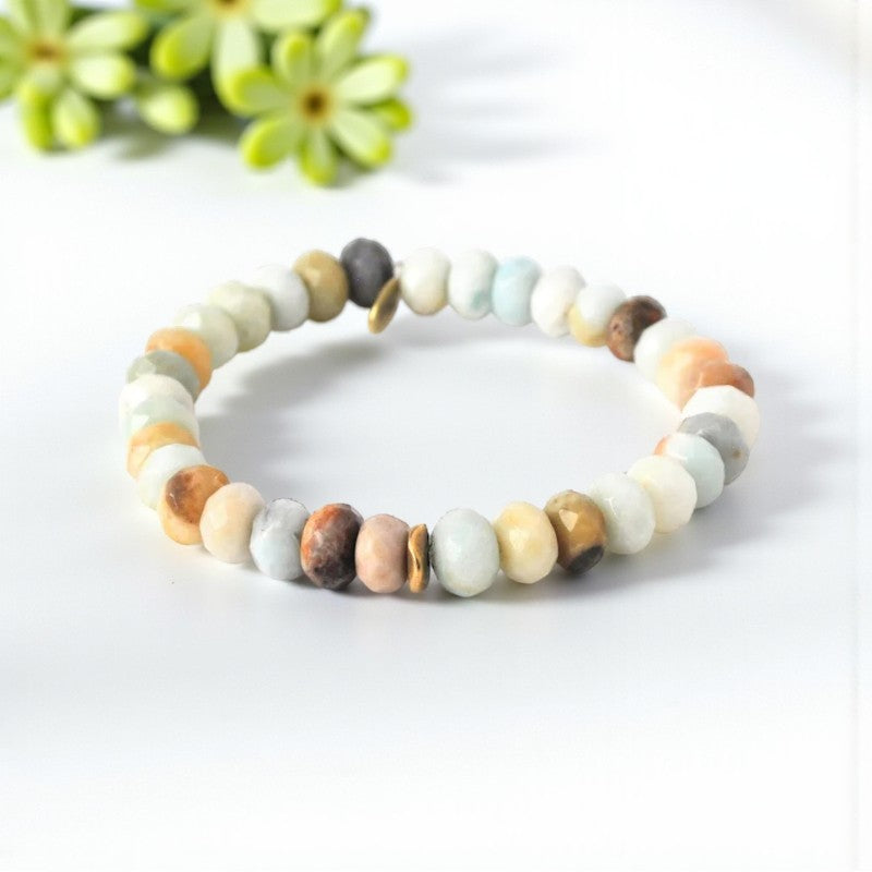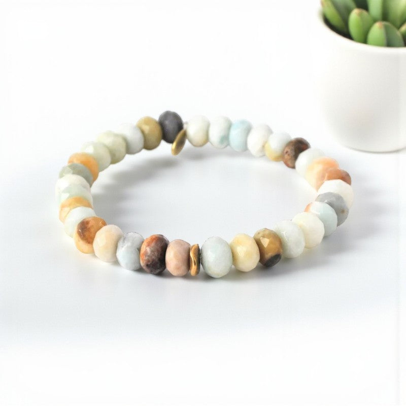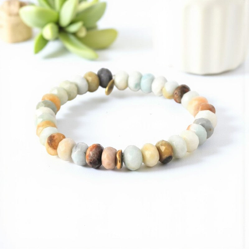 Transport yourself to a mental oasis with the 5mm rondel amazonite bracelet, featuring a single brass heishi bead for a touch of elegance. Each bracelet is a unique creation crafted to bring tranquility and balance to your life, with an average size of approximately 7 inches for women and 8 inches for men, strung on a durable clear elastic cord and adorned with a natural gold Infinite Warrior charm.