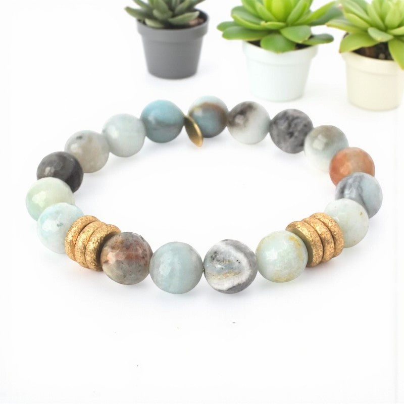 Embark on a journey of inner peace and emotional balance with the exquisite 10mm faceted Amazonite bracelet adorned with six brushed gold rings, a symbol of elegance and grace. Strung on a strong clear elastic cord and featuring a natural gold Infinite Warrior charm, this bracelet is a harmonious fusion of beauty and healing properties.