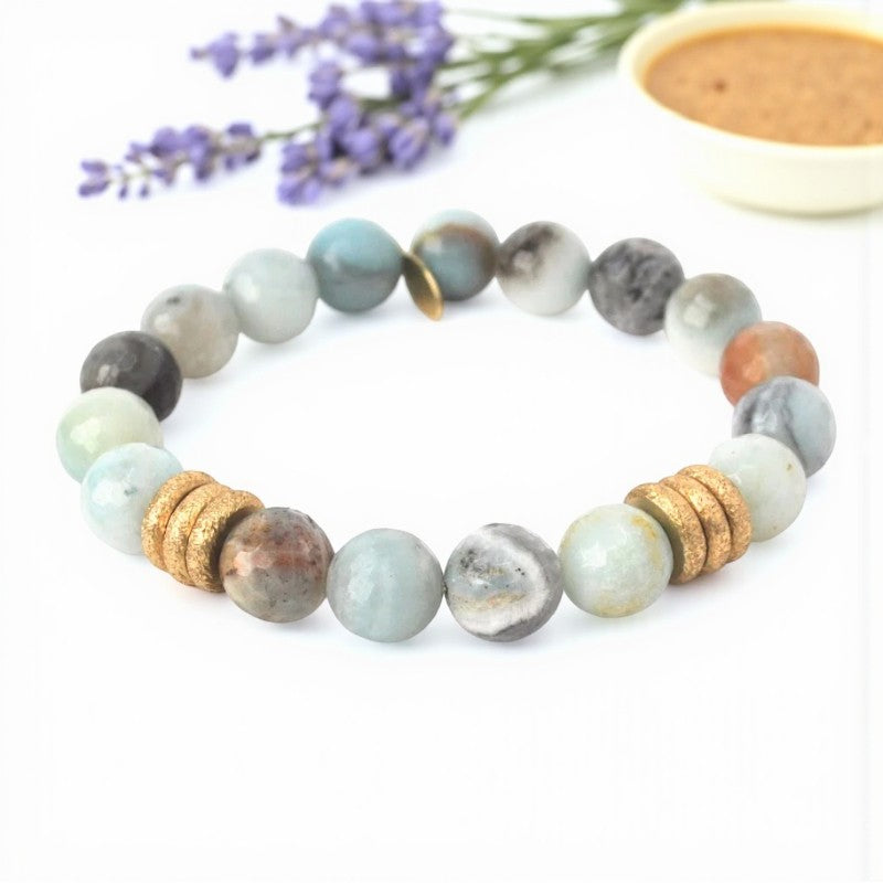 The Amazonite crystal within this bracelet resonates with the Heart and Throat Chakras, embodying the nurturing essence of Virgo. Known as a powerful eliminator of "monkey chatter," this stone has the remarkable ability to quiet a racing mind, reducing stress-like feelings and providing solace from anxiety. Infused with qualities of self-trust, integrity, and honor, Amazonite encourages self-love, clear communication, and sincerity, while soothing emotional trauma and worry. Additionally, it acts as a protective shield, safeguarding the wearer from electromagnetic pollution (EMR) and offering relief from muscle spasms, making it beneficial for those with osteoporosis.