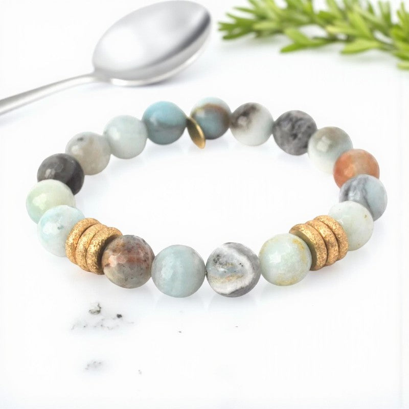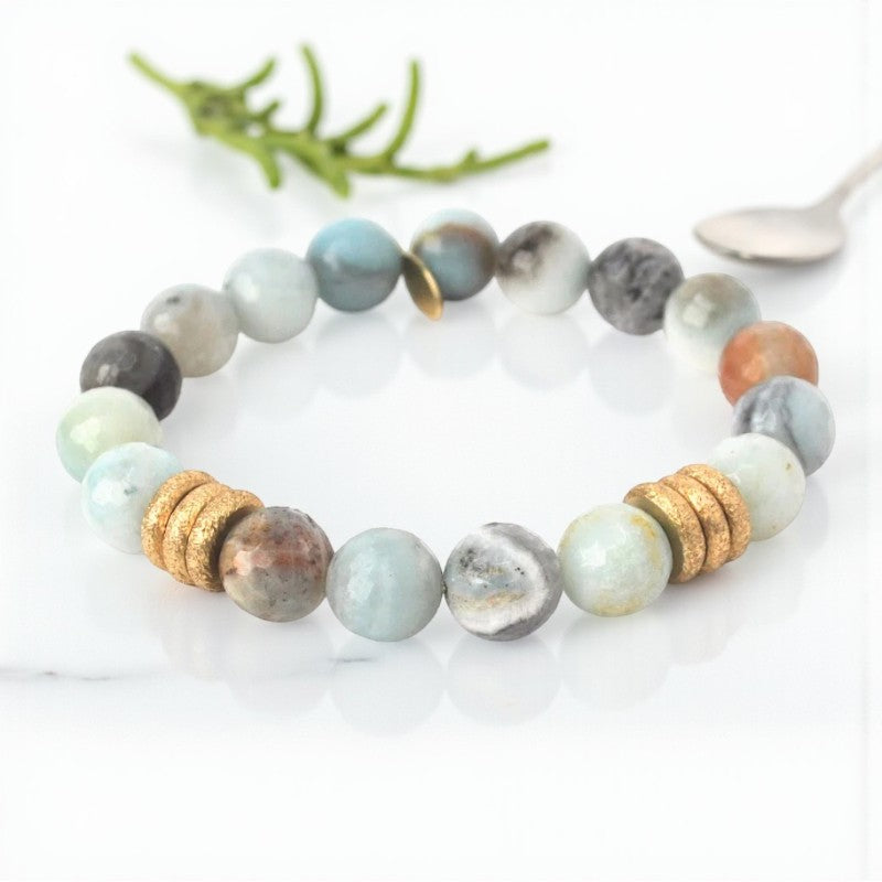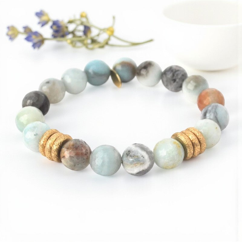 Embrace a life filled with happiness and joy as you work on quieting the mind with the Amazonite bracelet. Let its protective energies shield you from the harmful waves of modern technology, collecting and releasing them back to the earth to ensure your energetic equilibrium.