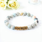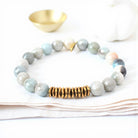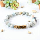 Indulge in the calming energies of the 8mm mystic amazonite bracelet, adorned with a brass heishi bead row for an added touch of elegance. Each bracelet is a unique creation designed to bring tranquility and balance to your life, with an average size of approximately 7 inches for women and 8 inches for men, strung on a durable clear elastic cord and finished with a natural gold Infinite Warrior charm.