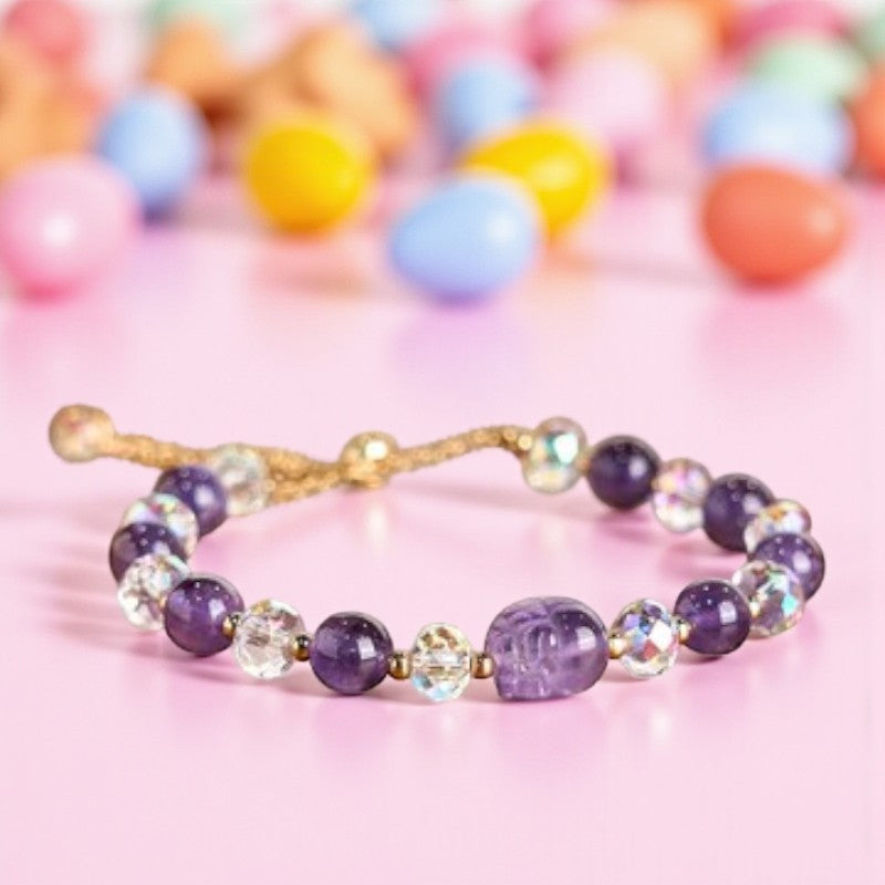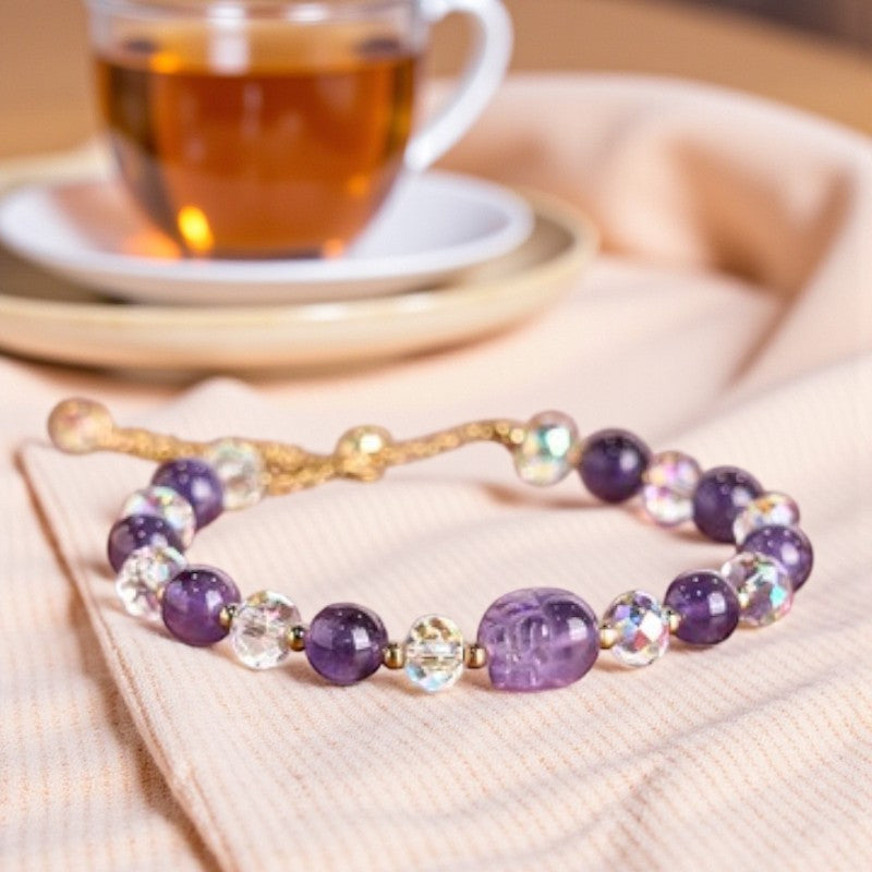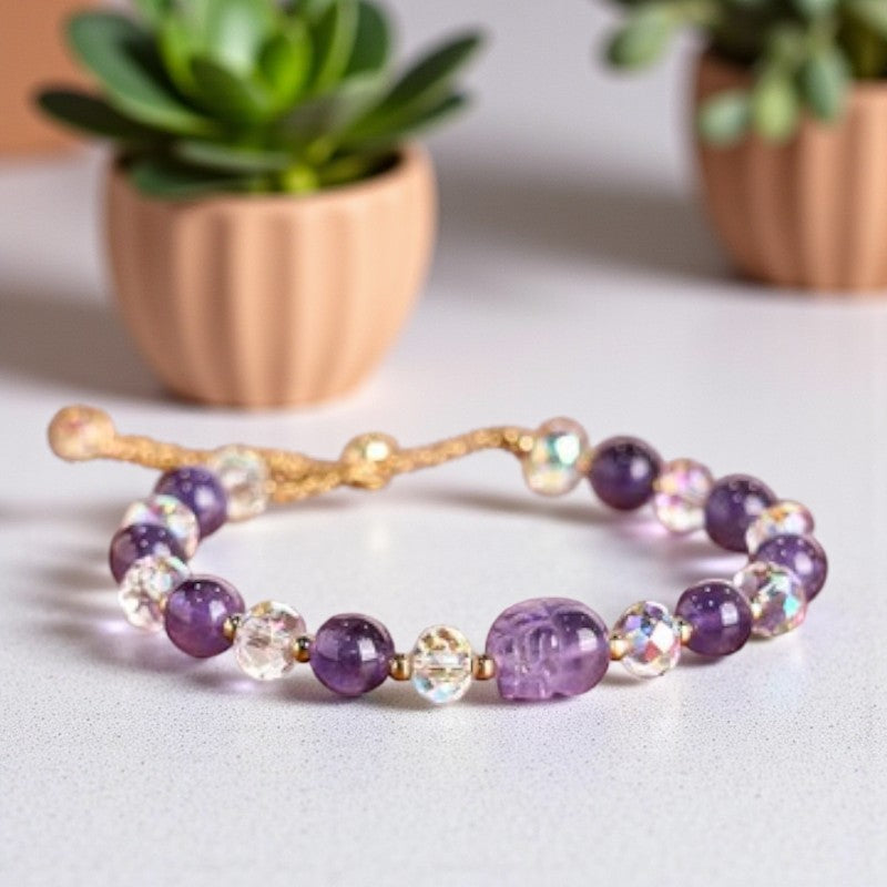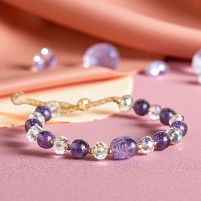Embark on a journey of spiritual harmony with our Mystic Harmony Amethyst Bracelet, a divine fusion of alternating Amethyst and Artificial Crystal beads culminating in a captivating Pixiu centerpiece. Let the soothing essence of Amethyst and the auspicious symbolism of Pixiu envelop you in a realm of tranquility and abundance. This bracelet is meticulously crafted to promote emotional balance, spiritual growth, and a radiant aura of positive energy, offering a sanctuary of peace and protection. 💫💜