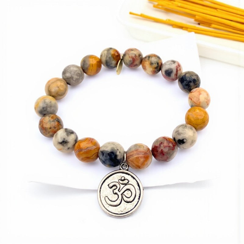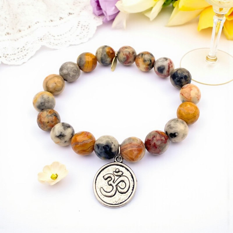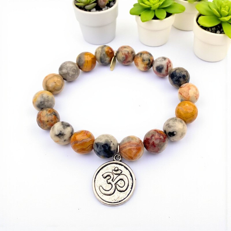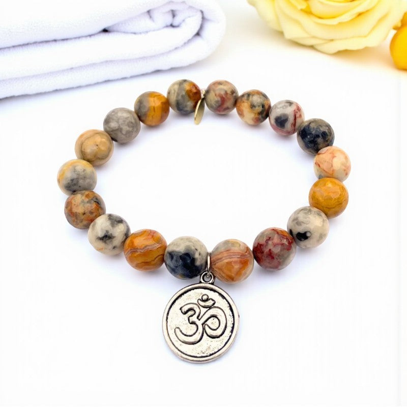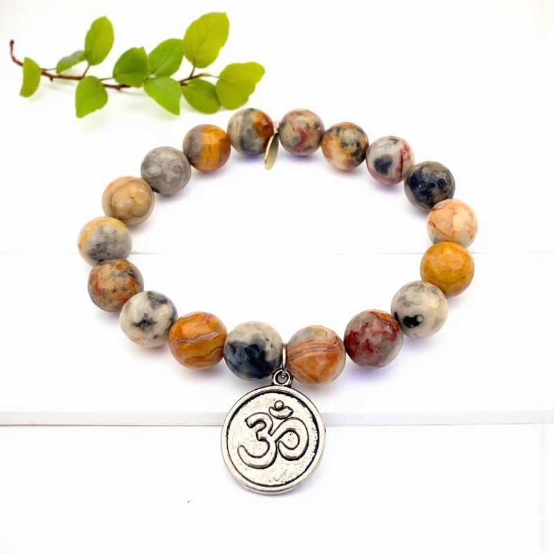 Experience a harmonious blend of love, abundance, and inner peace with the exquisite 10mm faceted Mexican crazy lace agate bracelet adorned with a silver om charm. This bracelet, crafted with a strong clear elastic cord and featuring a natural gold Infinite Warrior charm, resonates with the energies of the May birthstone and aligns with the zodiac signs of Gemini and Virgo.