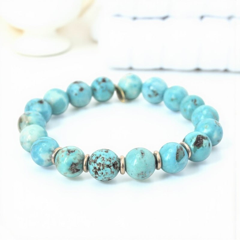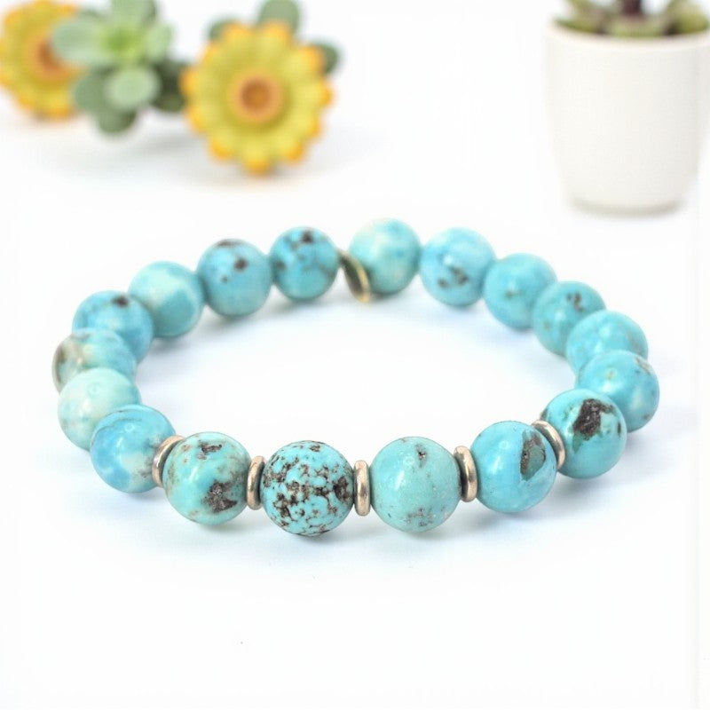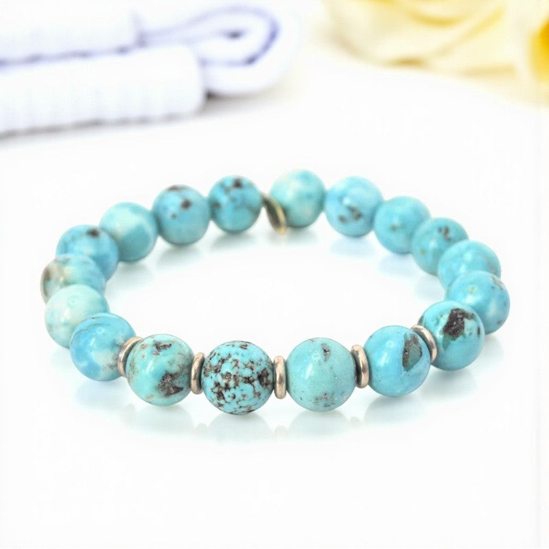 Experience the harmonious energy of the 10mm bright blue turquoise bracelet adorned with five sterling silver rings. Each bracelet is meticulously handcrafted with a natural gold Infinite Warrior charm and strung on a durable clear elastic cord, combining style with the powerful healing properties of turquoise.