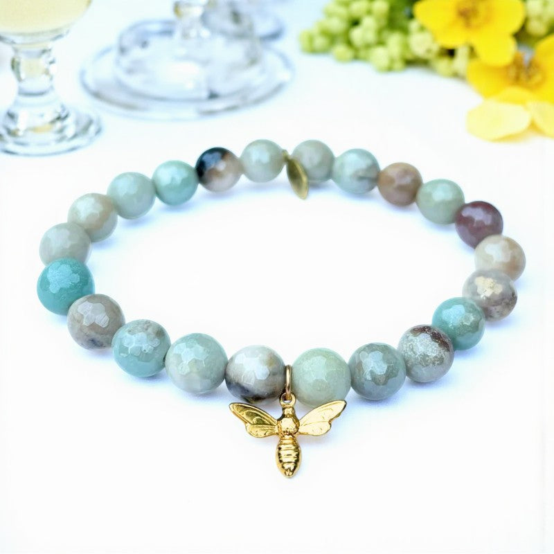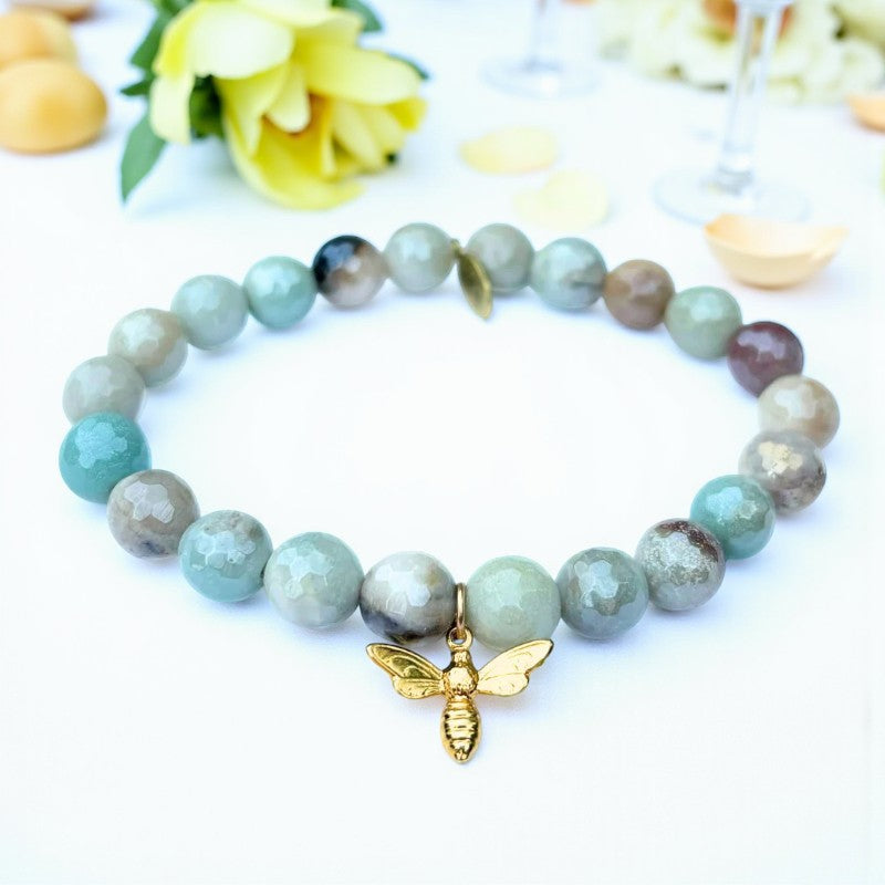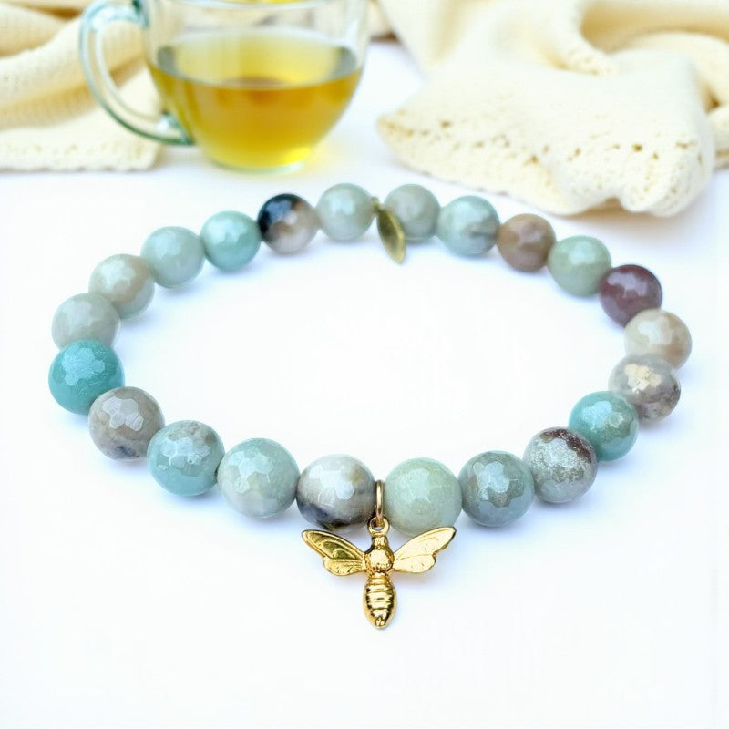 Embrace the tranquil energy of the 8mm Mystic Amazonite bracelet adorned with a charming gold bee charm. This exquisite piece resonates with the Heart and Throat Chakras, making it particularly beneficial for Virgos seeking inner harmony and emotional balance.