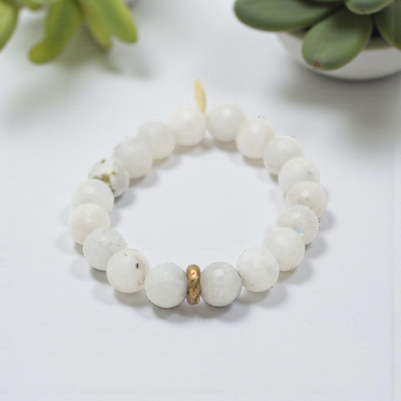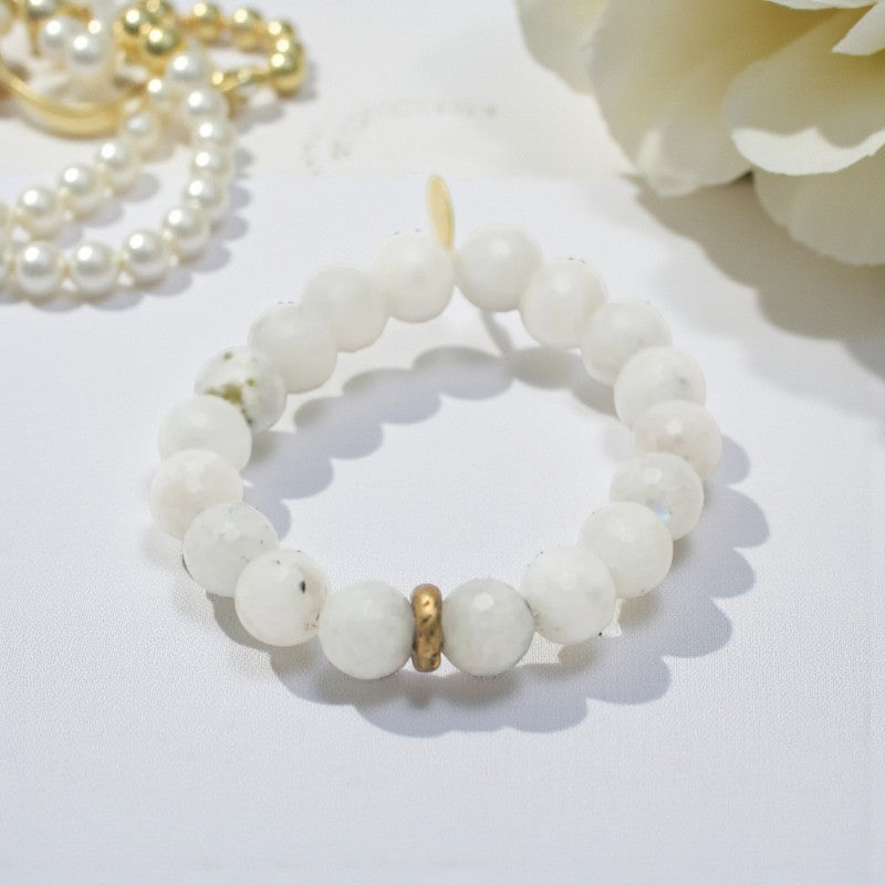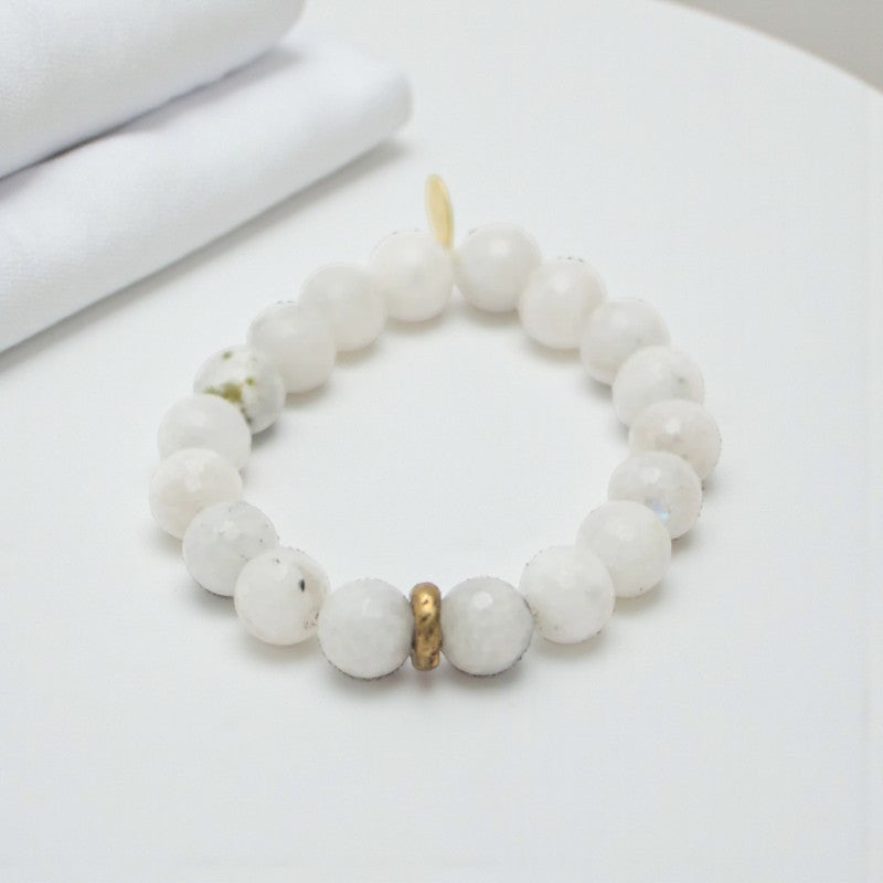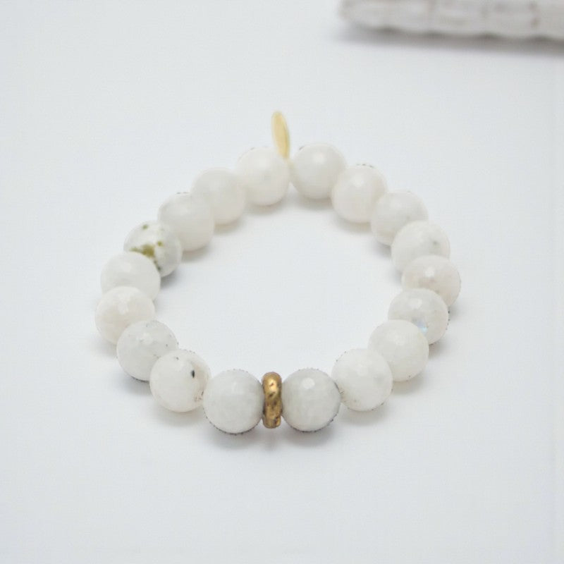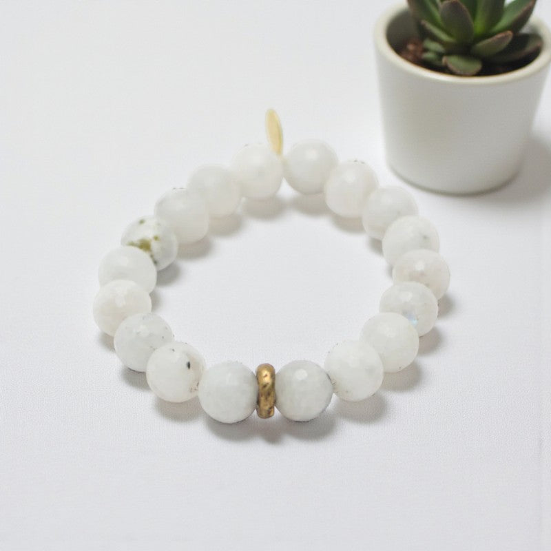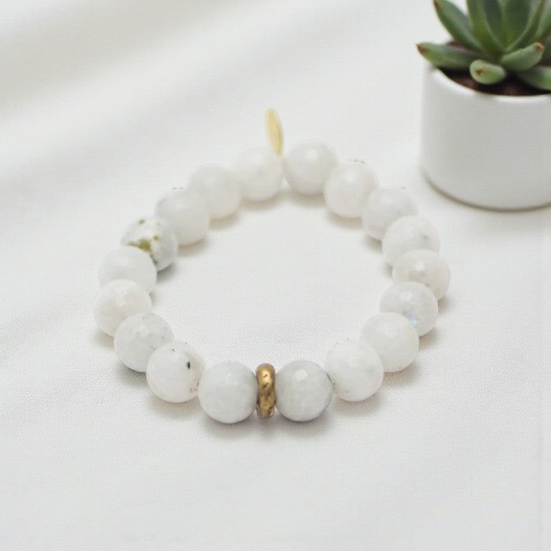 - Crafted with 10mm faceted moonstone beads and a brass ring