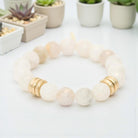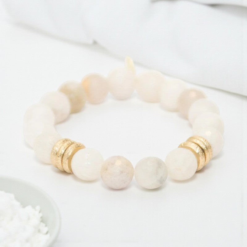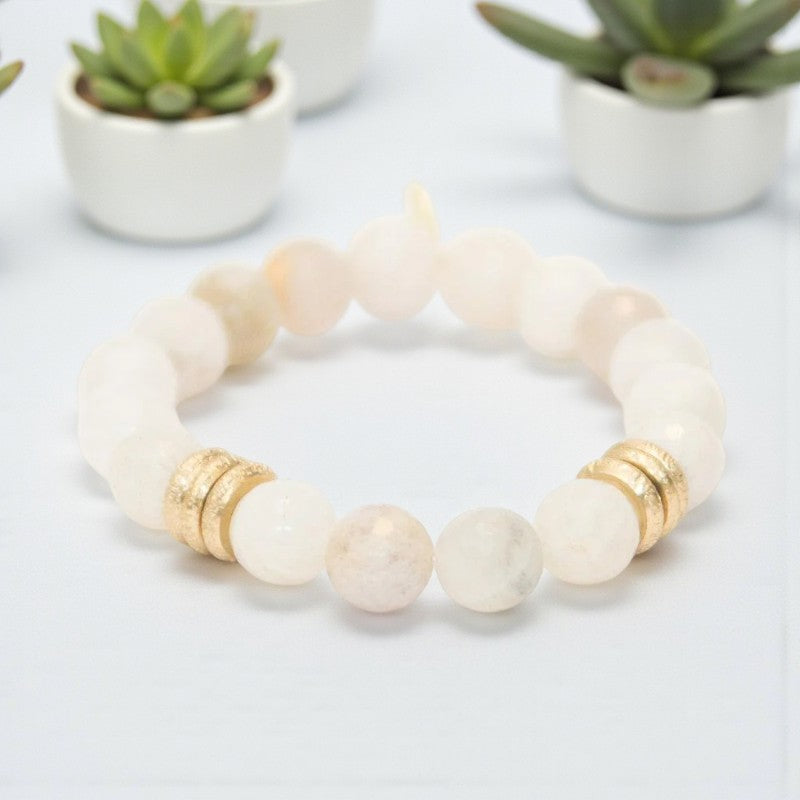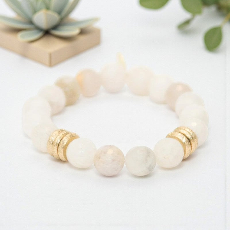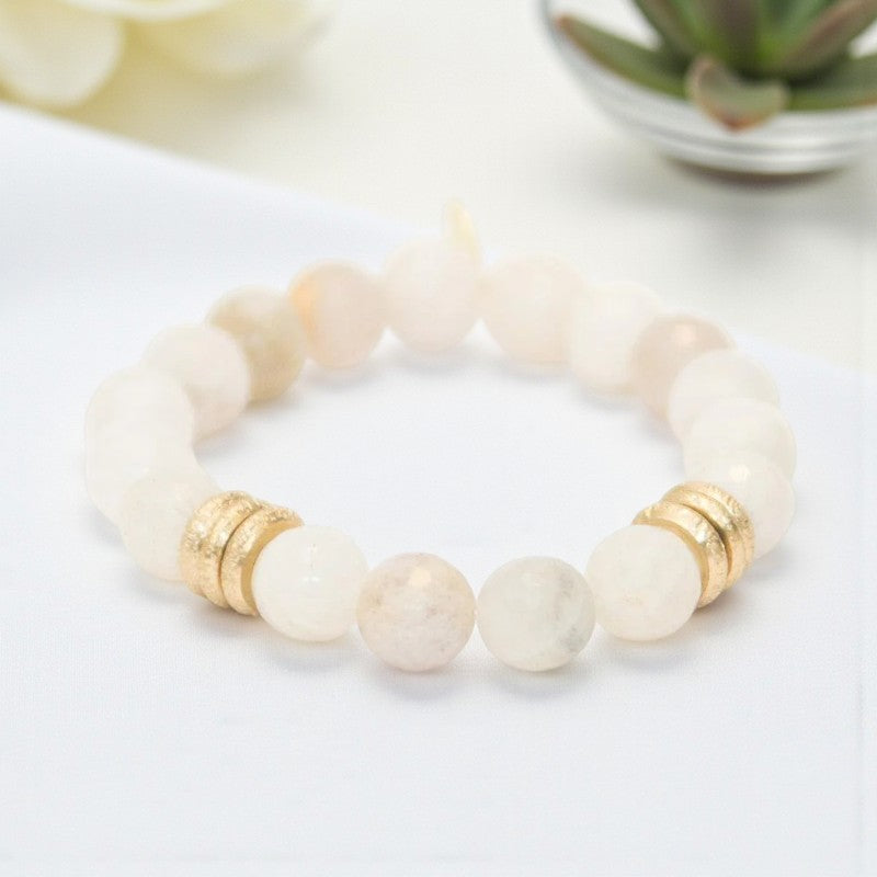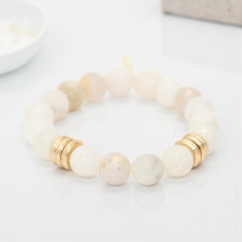 Unveil the harmonious energies of the Cream Moonstone Bracelet, a symbol of inner strength, fertility, and emotional balance. Featuring 10mm faceted cream moonstone beads adorned with brushed gold rings, this bracelet resonates with the Third Eye and Solar Plexus Chakras, offering blessings of happiness, love, and success. Crafted to nurture, provide abundance, and enhance spiritual insight, this bracelet symbolizes safe travels, new beginnings, and inner strength. With its supportive properties for conception, pregnancy, childbirth, and breastfeeding, as well as its ability to balance the hormonal cycle and ease PMS symptoms, the Cream Moonstone Bracelet is a holistic talisman for overall well-being.