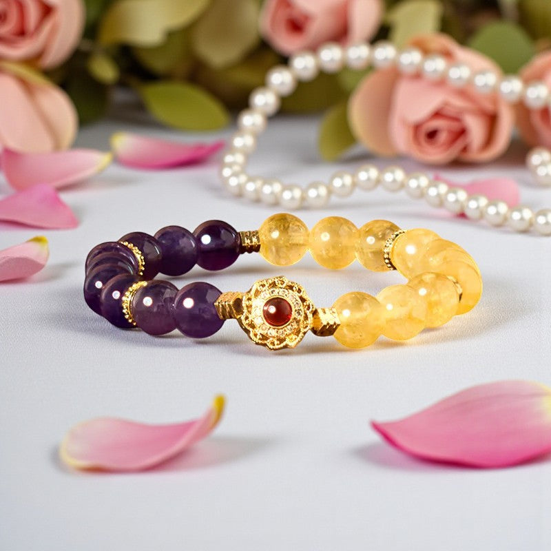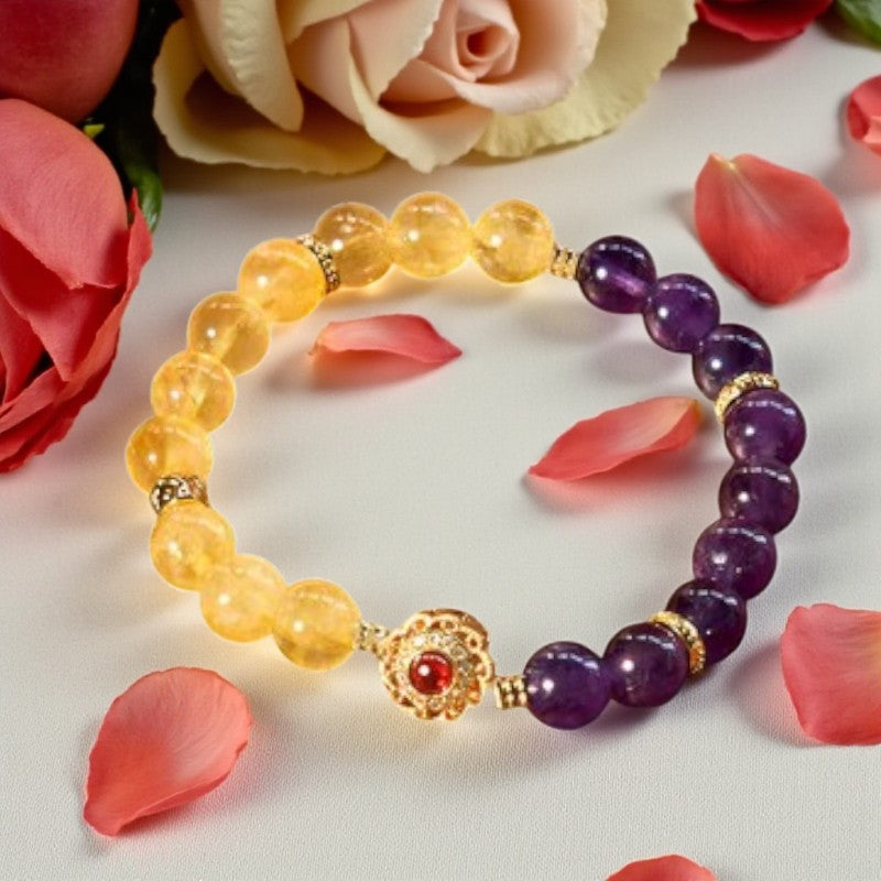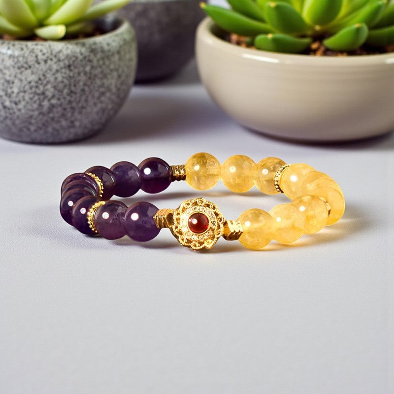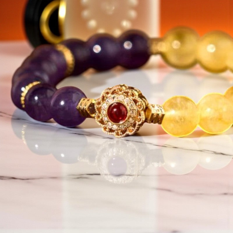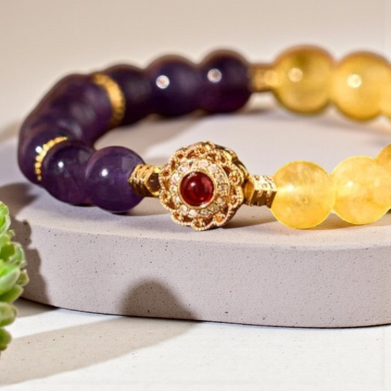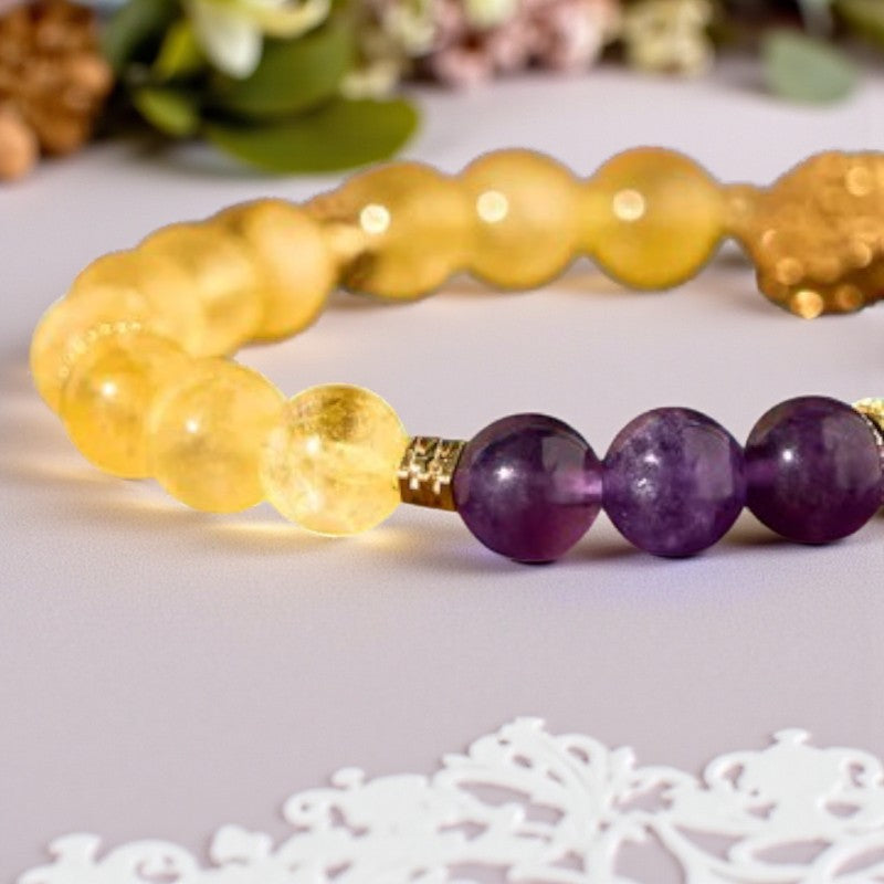 The Golden Amethyst Harmony Bracelet harmoniously blends the radiant energies of golden citrine and calming amethyst beads, each gemstone exquisitely balanced in representation. Citrine, symbolizing joy and abundance, intertwines with amethyst, known for clarity and emotional healing, to create a symphony of positivity and spiritual equilibrium. This unique fusion engenders a potent aura of pleasure, spiritual balance, and boundless positivity, elevating emotional well-being and fostering a deeper sense of mindfulness. Embrace this bracelet as a profound symbol of peace and personal growth, a talisman of serenity in the journey of self-discovery and inner harmony.💫