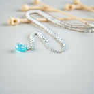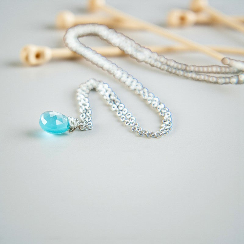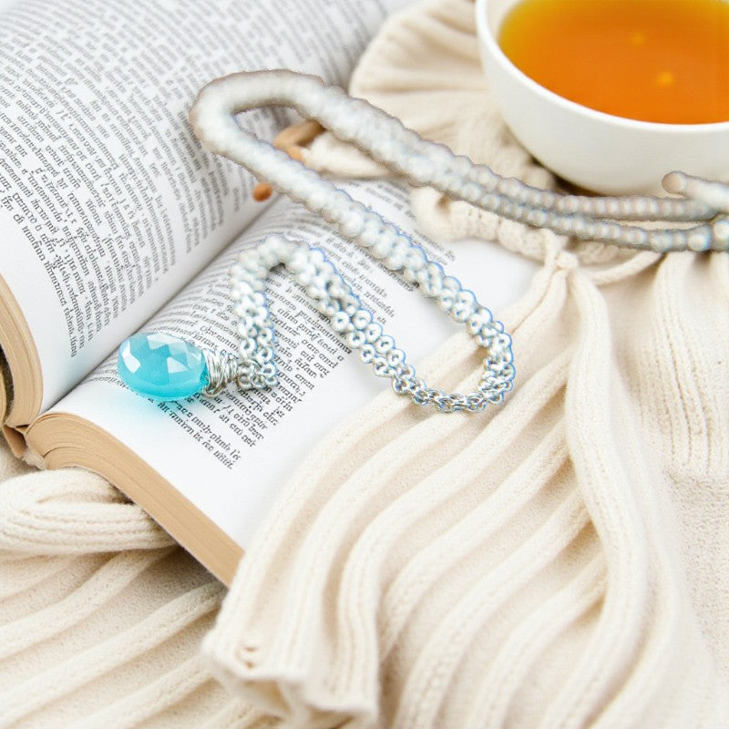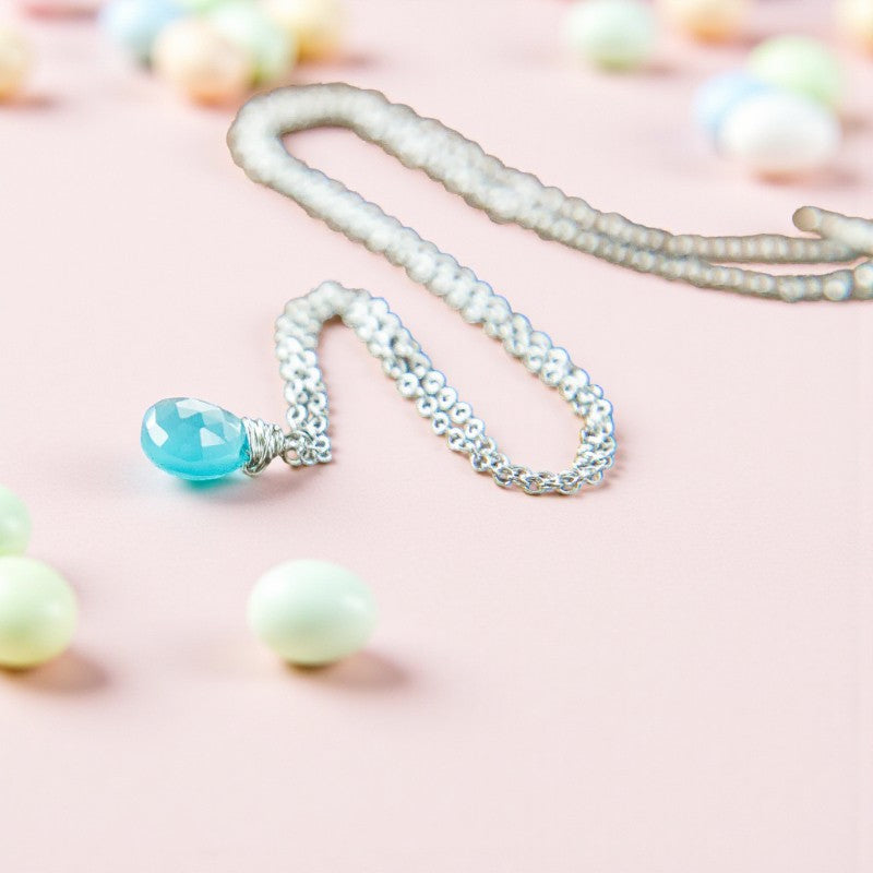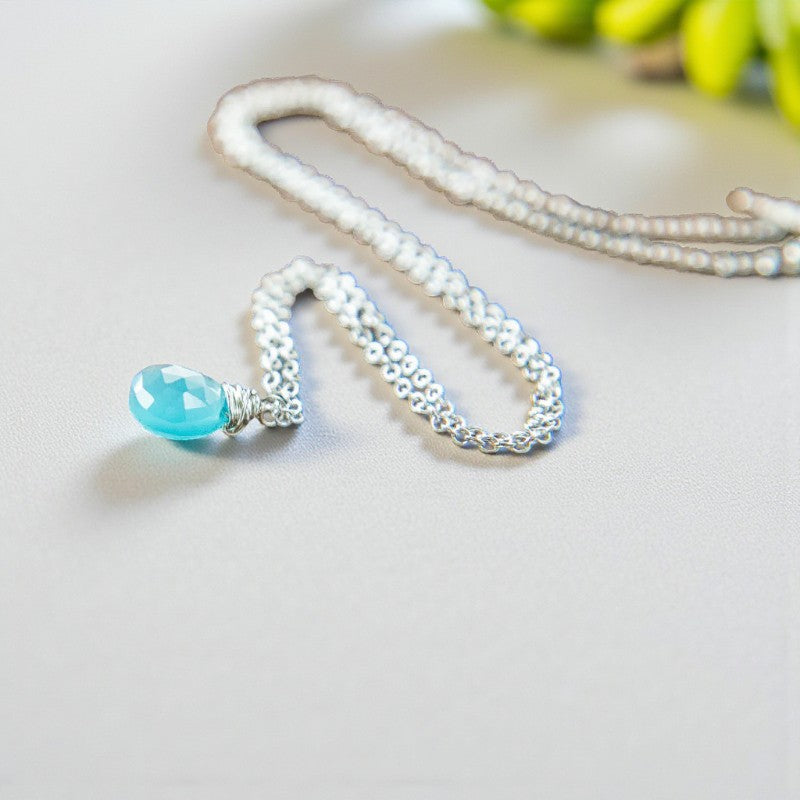 The delicate chain, available in silver or gold-filled upon request, serves as the perfect backdrop for the Blue Chalcedony pendant, enhancing its allure.