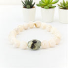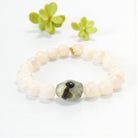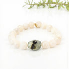 Moonstone, known as the semi-precious birthstone for June, embodies qualities of happiness, love, and success, nurturing abundance, spiritual insight, safe travels, new beginnings, and inner strength. It aids in fertility, conception, pregnancy, childbirth, breastfeeding, hormonal balance, and alleviating PMS symptoms, while stimulating the pineal gland to regulate the sleep-wake cycles. This bracelet, aptly named "The Baby Maker," combines Moonstone with a soothing prehnite center stone for enhanced fertility benefits.