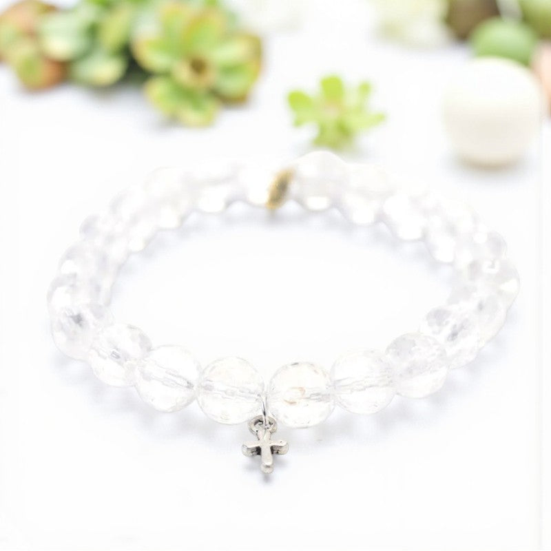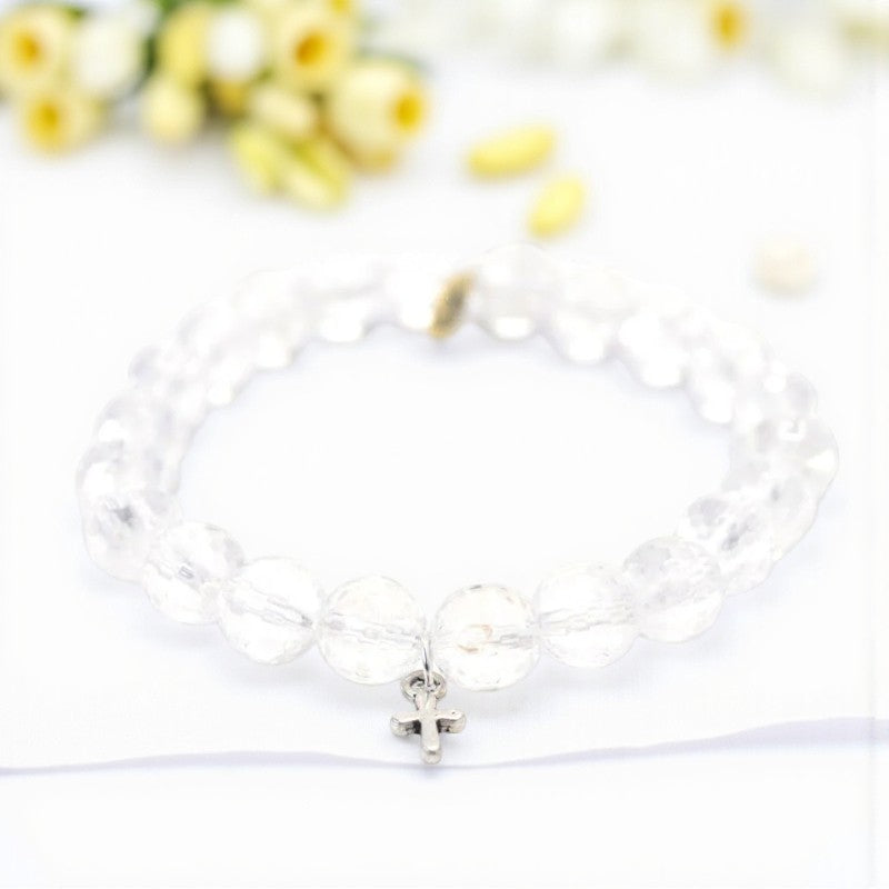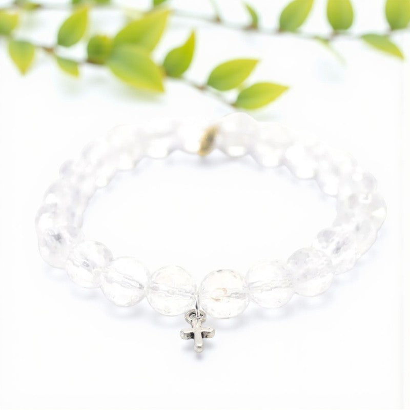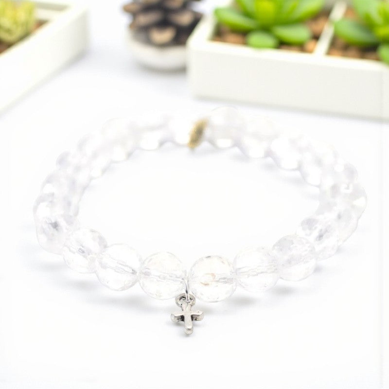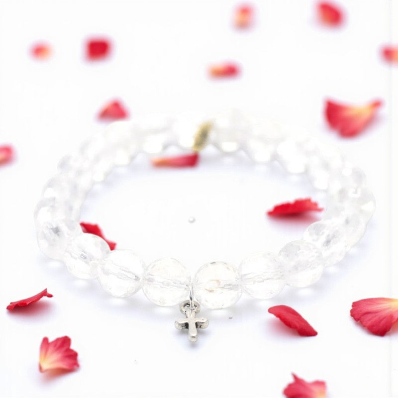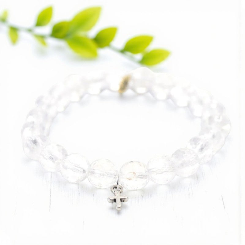 Divine Clarity: Clear Quartz Bracelet with Faceted Beads and Silver Cross