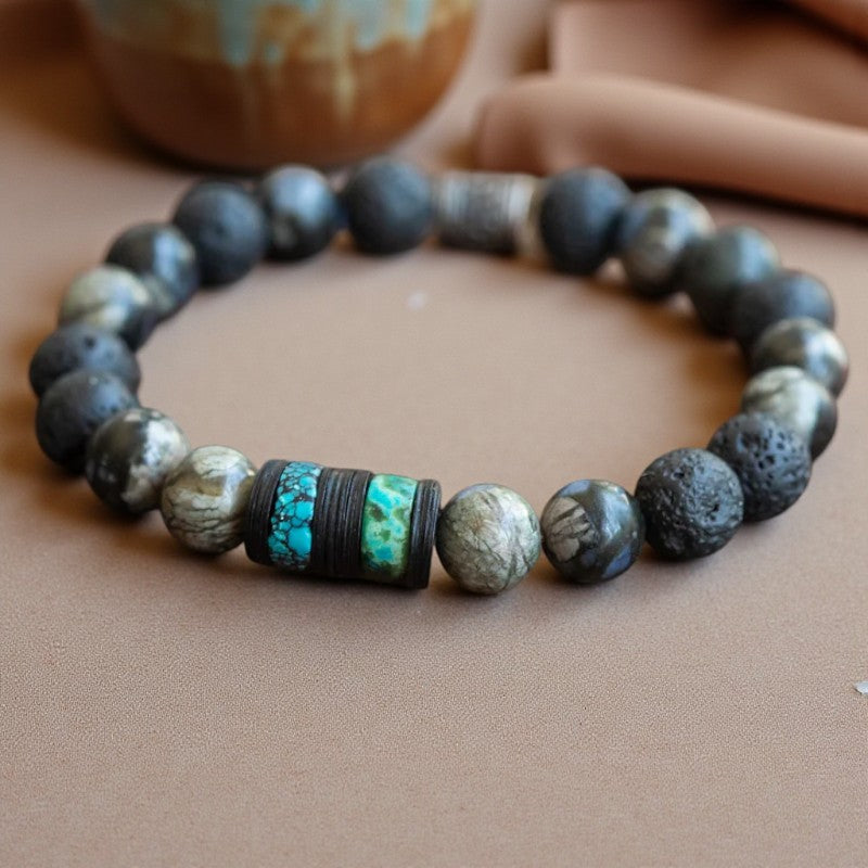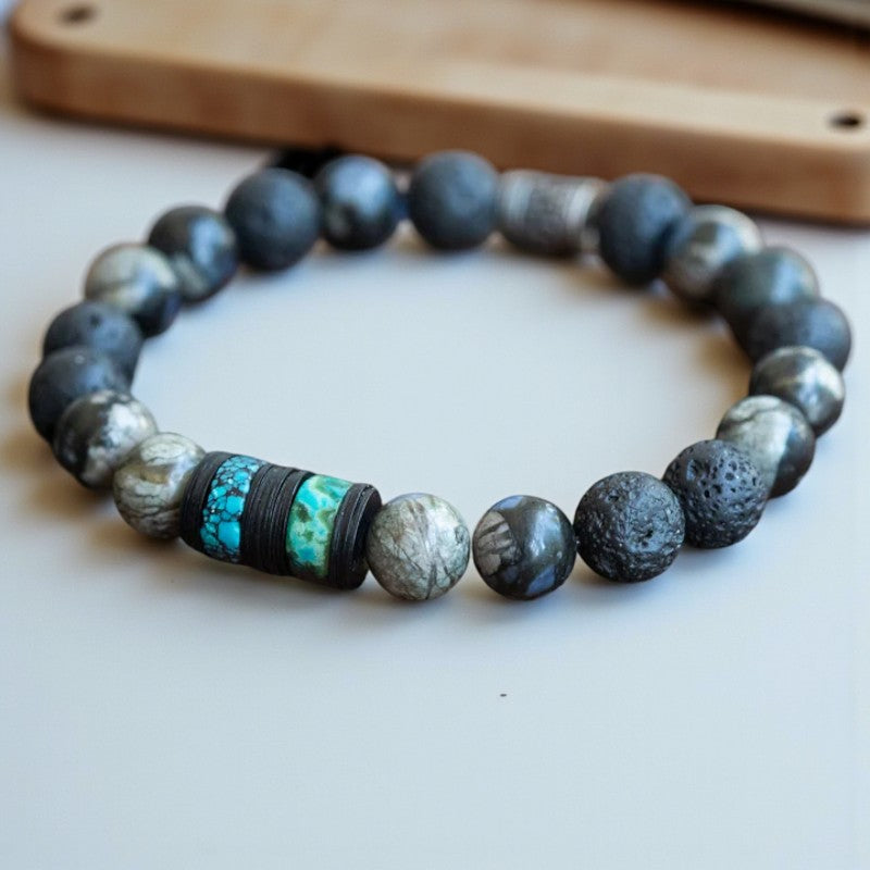 Earthen Resilience: Men's African Grey Opal, Pyrite, Turquoise, Lava Rock Stacking Bracelet