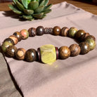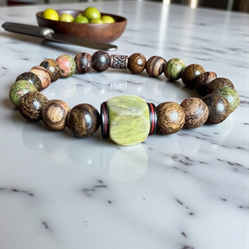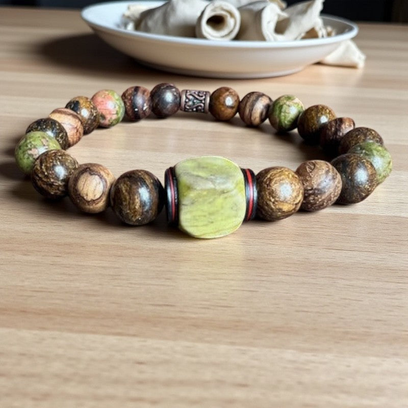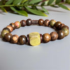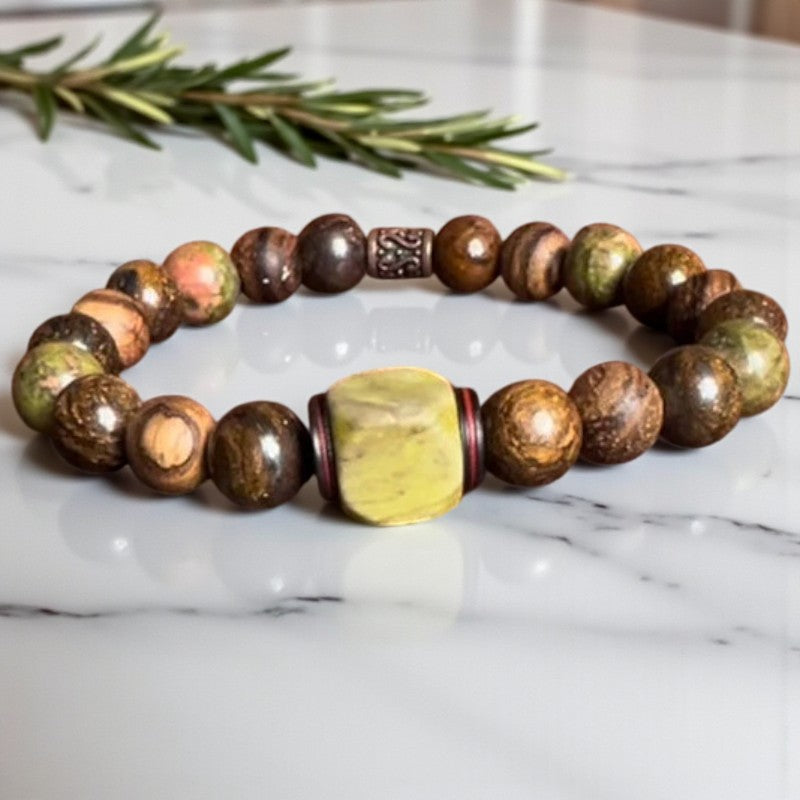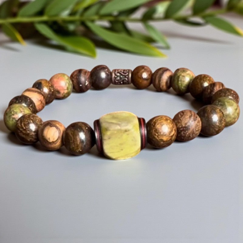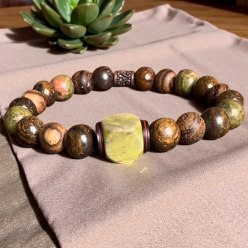 Earth's Symphony: Men's Boho Style Bracelet featuring Green Turquoise, Bronzite, Unakite, and Wood