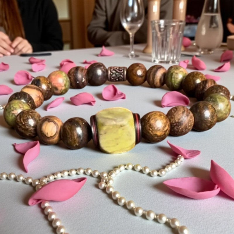 The name of this bracelet reflects the fusion of natural elements woven into its design, highlighting the seamless blend of healing crystals, wood beads, and vintage silver. It signifies a bond with the earth's energies, fostering tranquility and equilibrium.