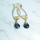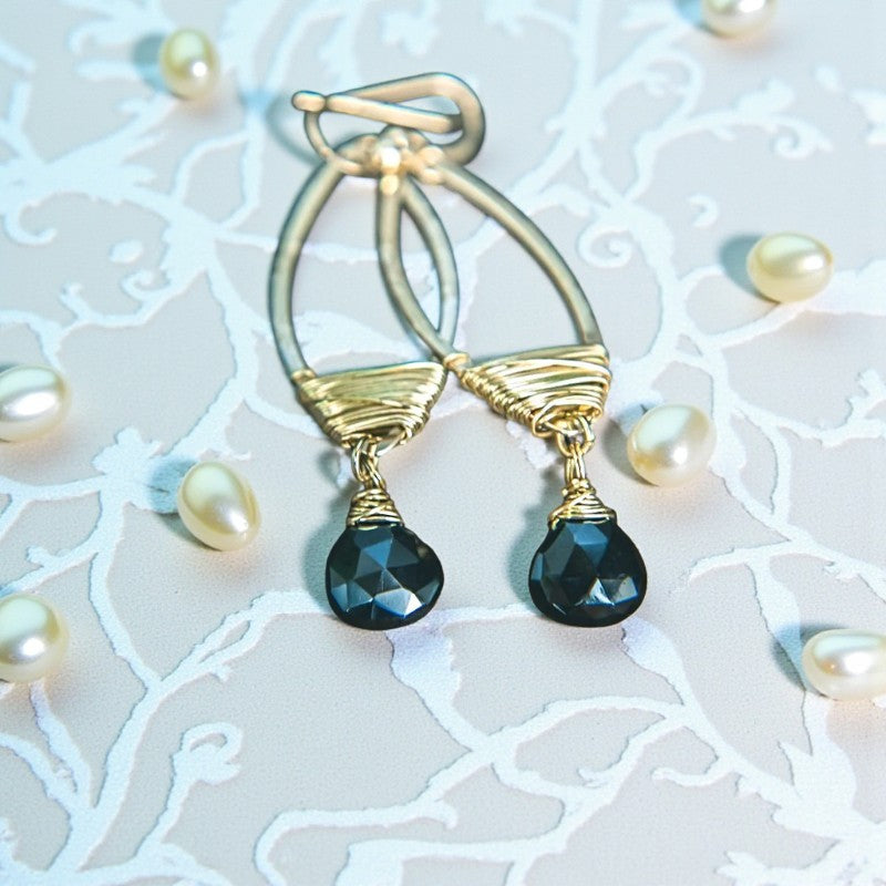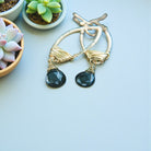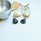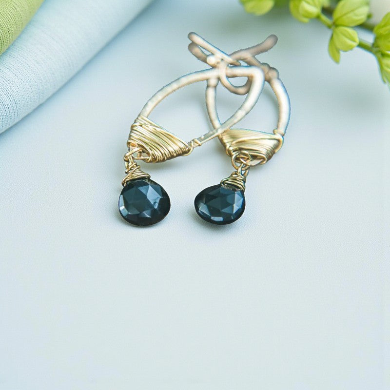 The intricate gold-filled wire delicately wraps around the teardrop frame, accentuating the captivating allure of the black Onyx gemstone. The stunning interplay of light and shadow creates a mesmerizing glow that instantly captures attention, while the crystal gracefully sways from the earring frame, evoking a sense of fluidity and grace.