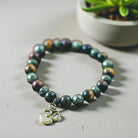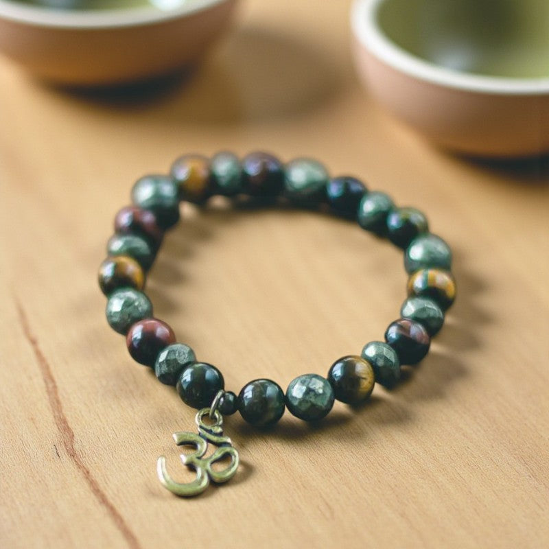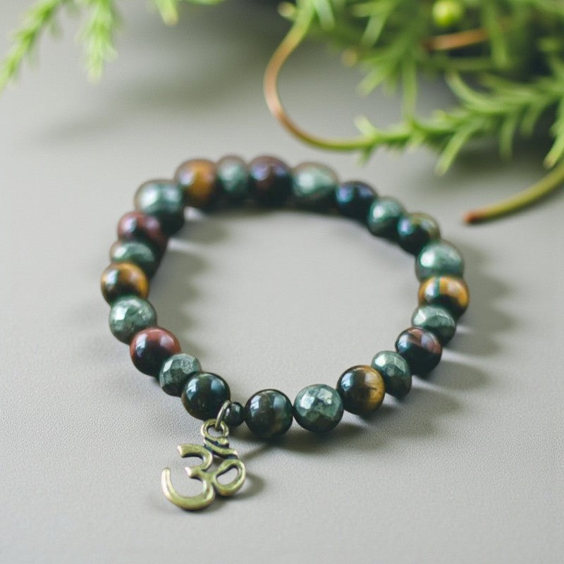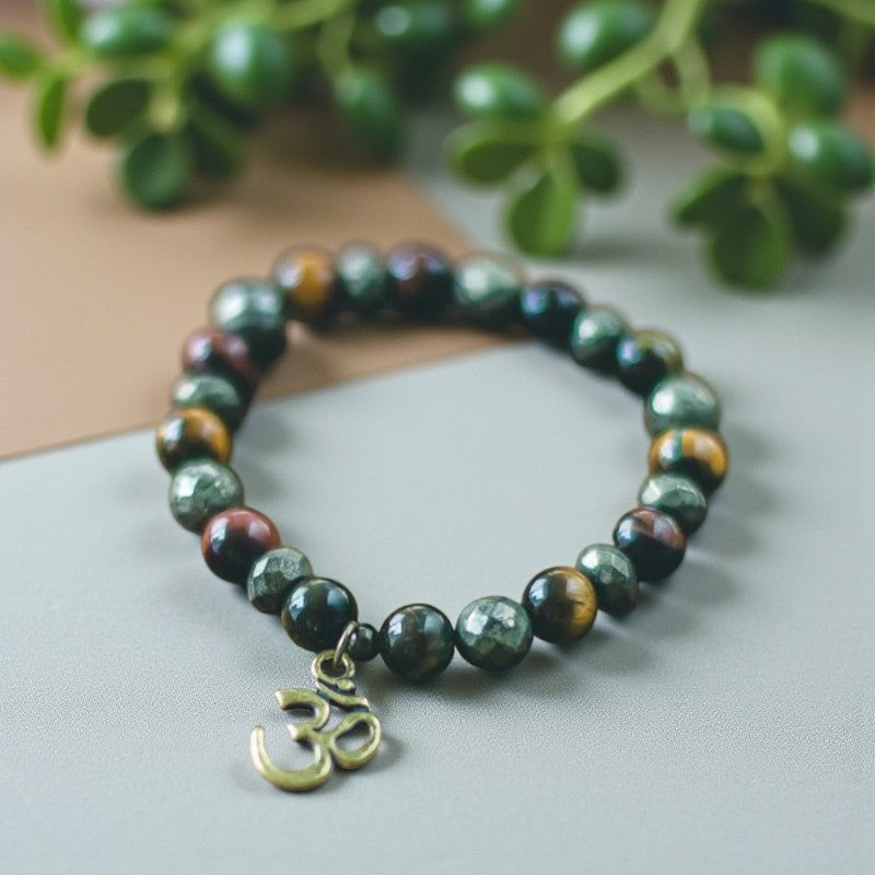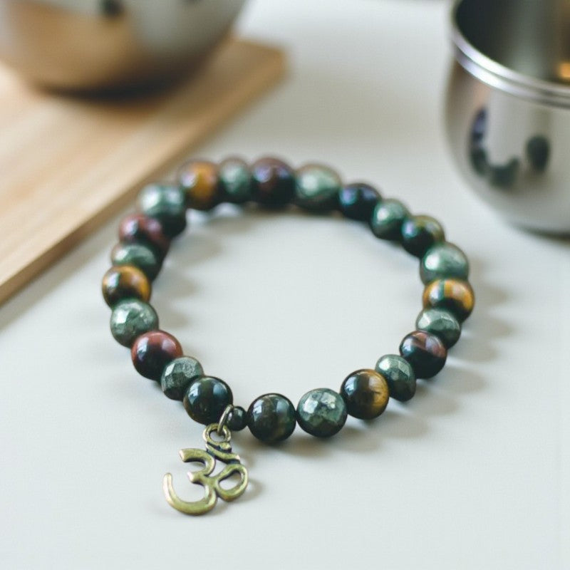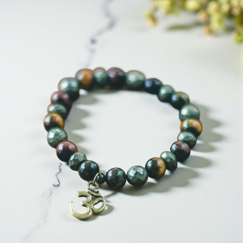 Looking to illuminate the shadows in your life? Seeking strength and bravery? The vibrant hues of multi-colored Tiger's Eye, paired with faceted pyrite and pyrite rondelles, promise the transformative journey you desire. This eye-catching and versatile bracelet is infused with a spiritual essence through the Om charm.