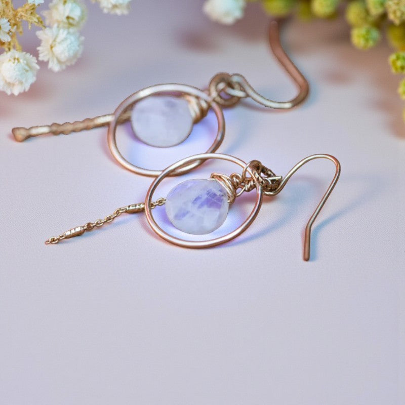 The moonstone featured in these earrings is a symbol of femininity and is believed to bring joy, luck, love, and prosperity. Known for its association with inner growth and empowerment, moonstone signifies new beginnings, offering emotional stability, tranquility, and intuition. It is a crystal that inspires success, attracts good fortune in both personal and professional endeavors, and exudes a charming aura that uplifts spirits and fosters generosity.