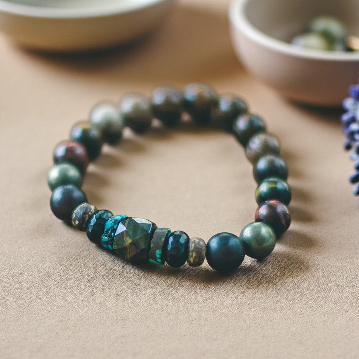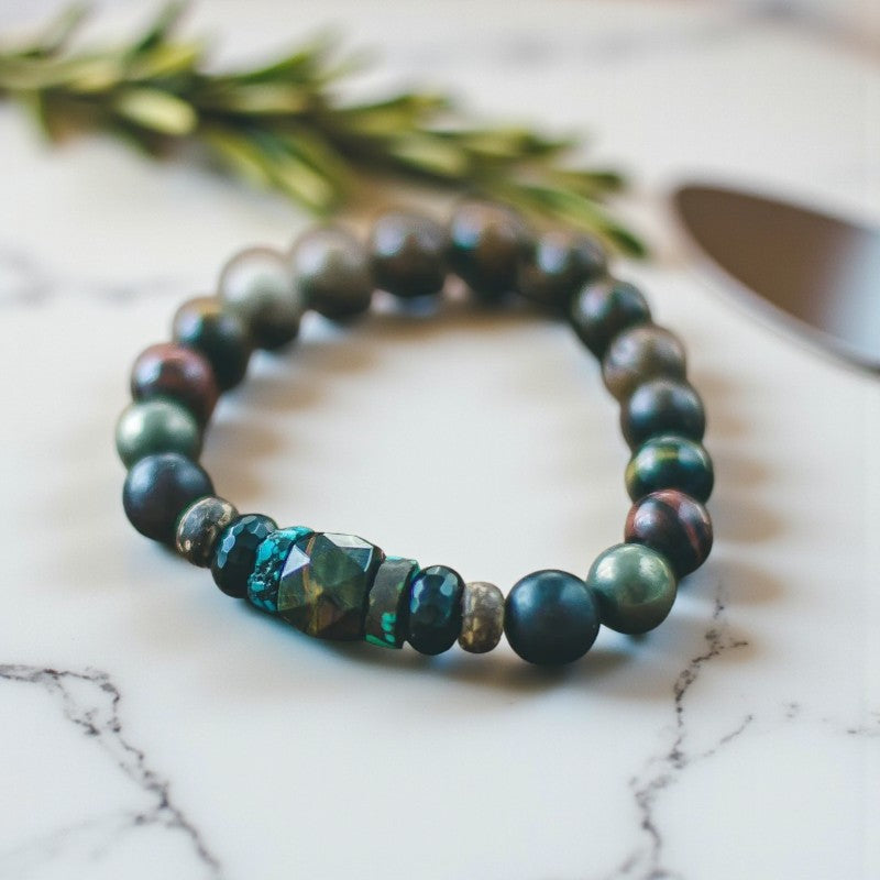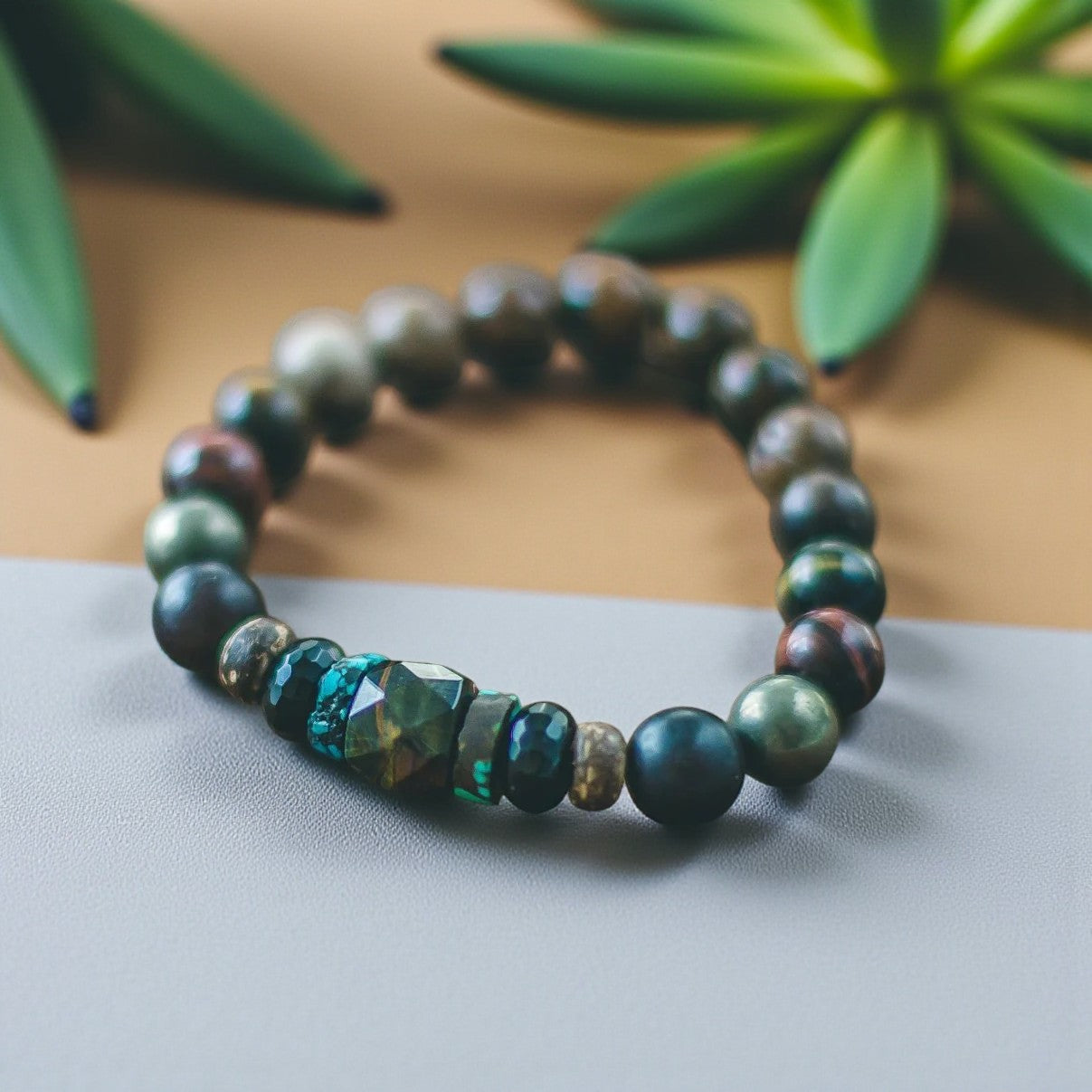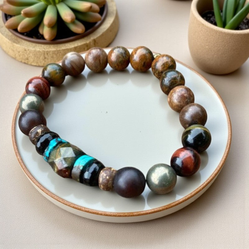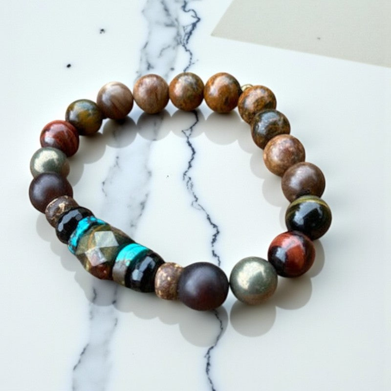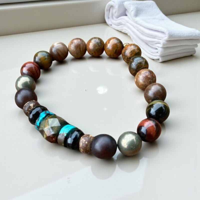 Step into the limelight with this ruggedly handsome men's stacking bracelet, designed to captivate attention and earn you admiration. Crafted from a diverse selection of exquisite gemstones, this bracelet exudes an air of mystery and charm. Featuring the rare and powerful energies of Tiger's Eye, pyrite, and fire opal, it is a true standout piece.