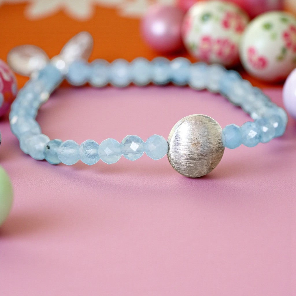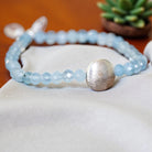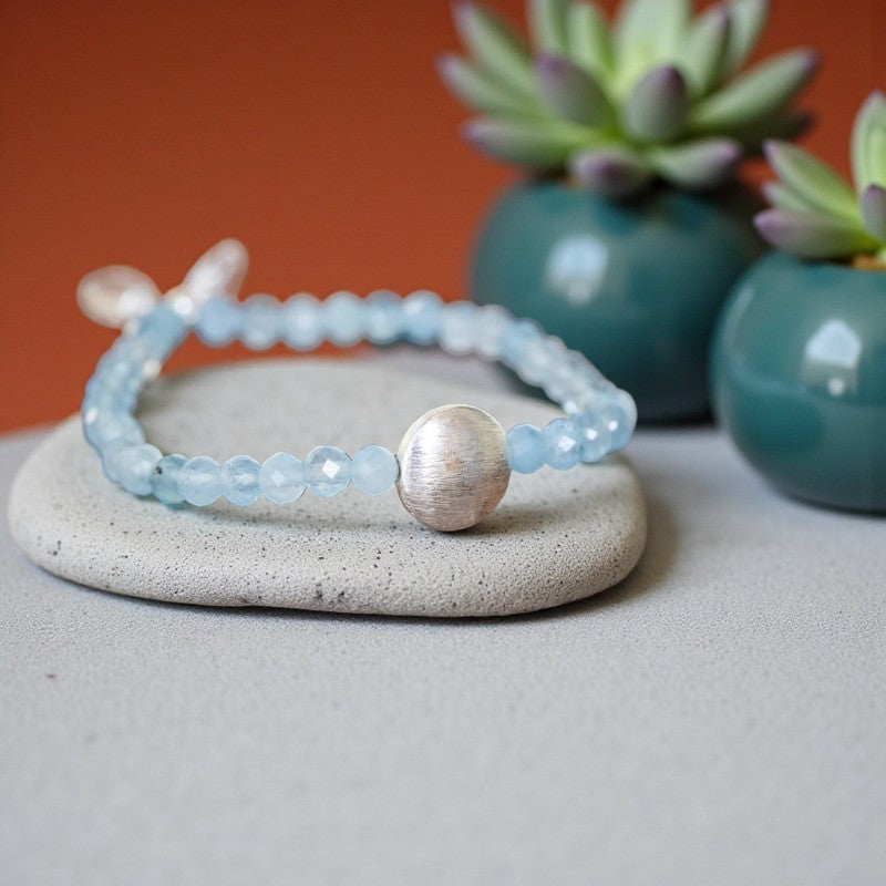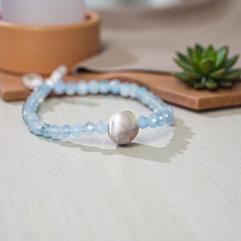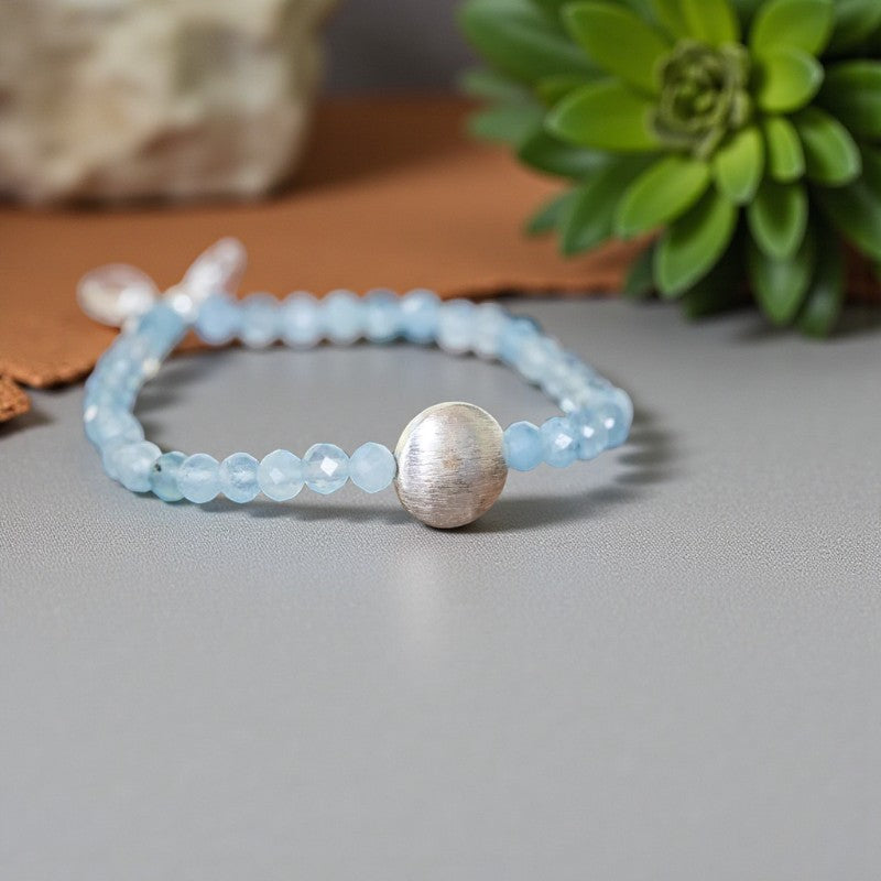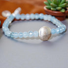 This exquisite bracelet features a harmonious blend of soft and vibrant energy, with faceted aquamarine stones exuding a gentle yet powerful aura, complemented by a central silver designer brushed bead.