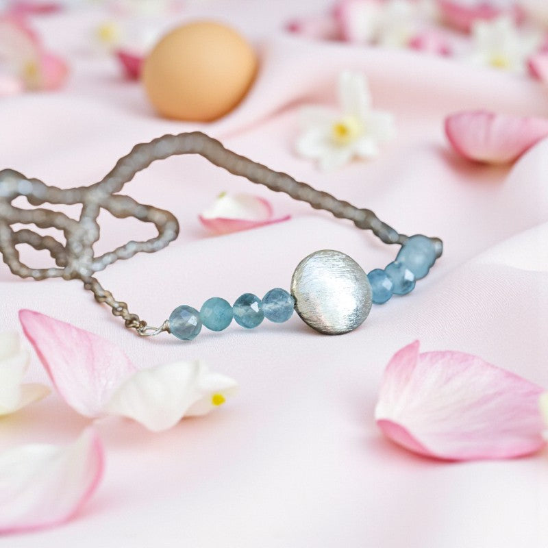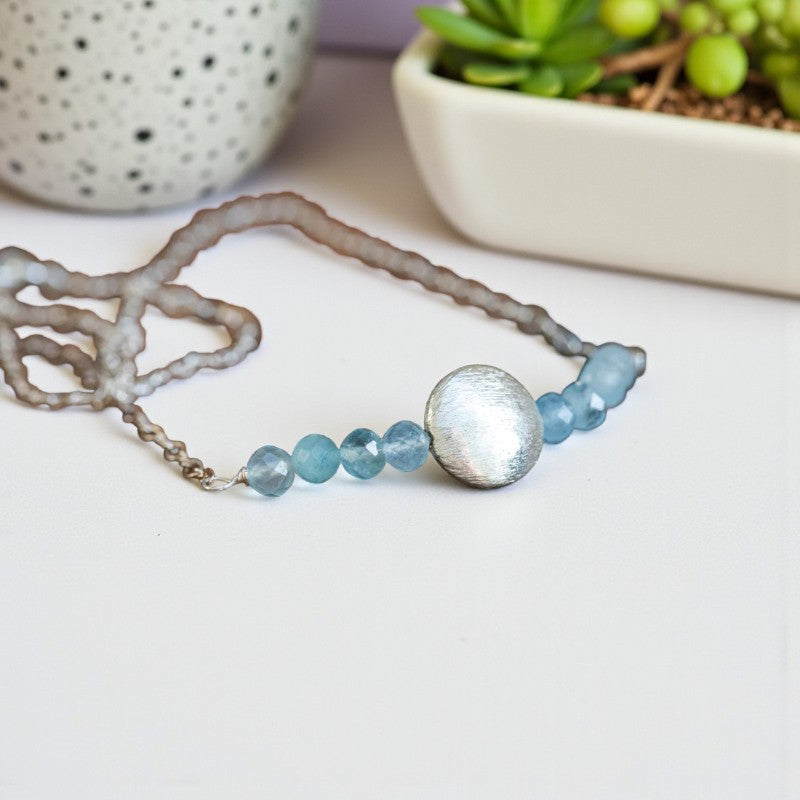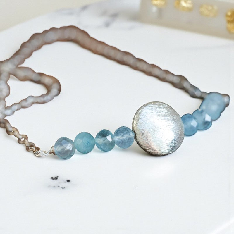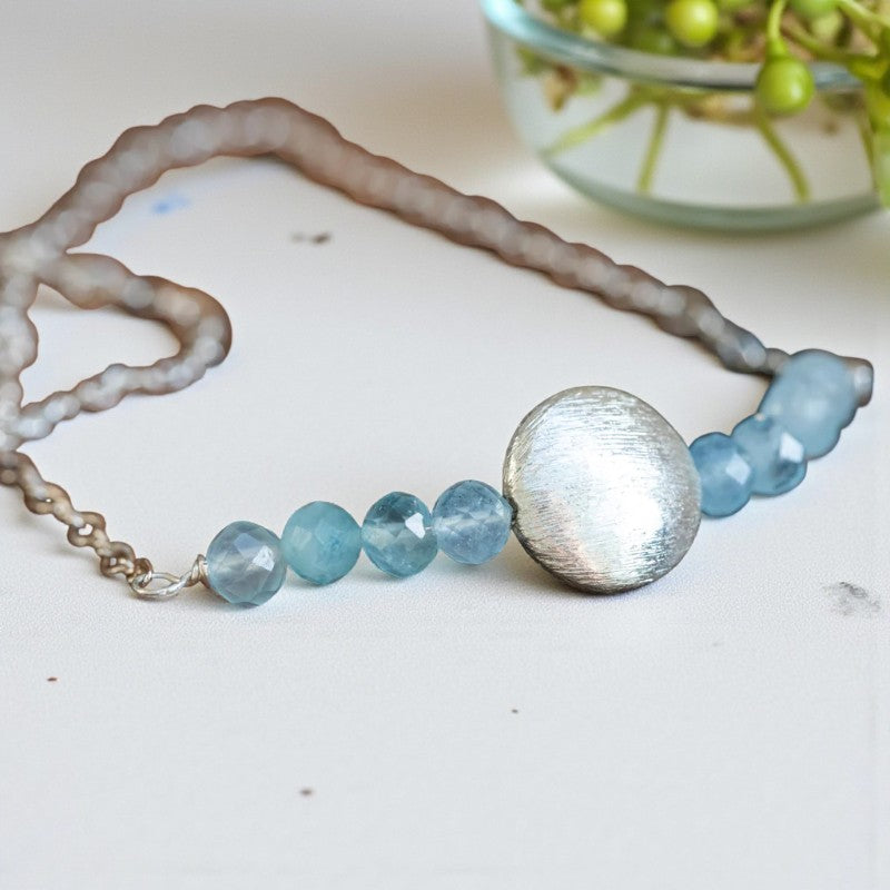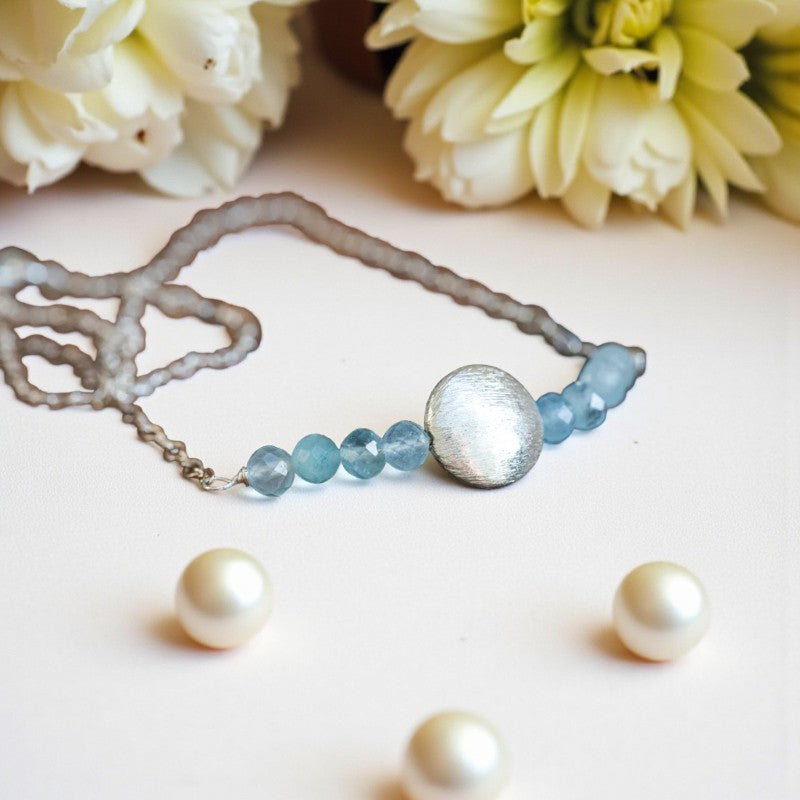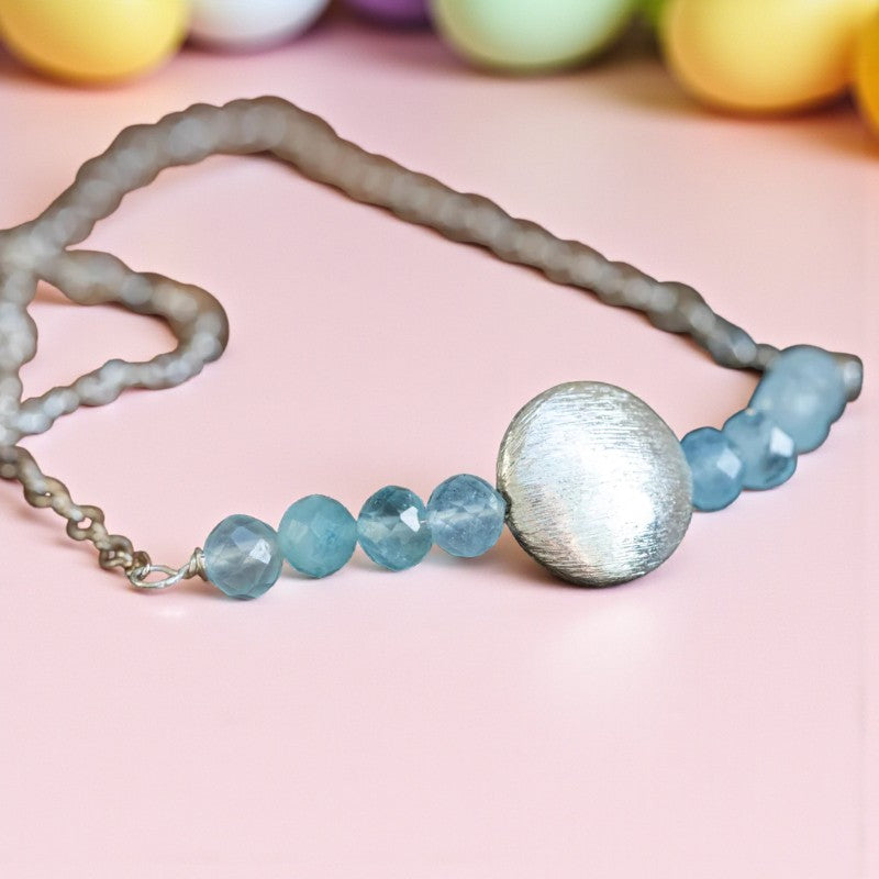 Experience the harmonious blend of soft elegance and vibrant energy with our aquamarine sterling silver necklace, a captivating creation that exudes a sense of tranquility and grace. At its core, faceted aquamarine stones intertwine with a silver designer brushed bead, forming a mesmerizing union of beauty and sophistication.