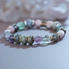 This eye-catching bracelet features a variety of shapes and sizes, from smooth, round stones to faceted gems, creating a dynamic and textured appearance. The vibrant bands of rainbow fluorite, mystical flashes of labradorite, gentle hues of kunzite, and sleek metallic sheen of hematite blend seamlessly to form an exquisite color palette that captivates and uplifts.
