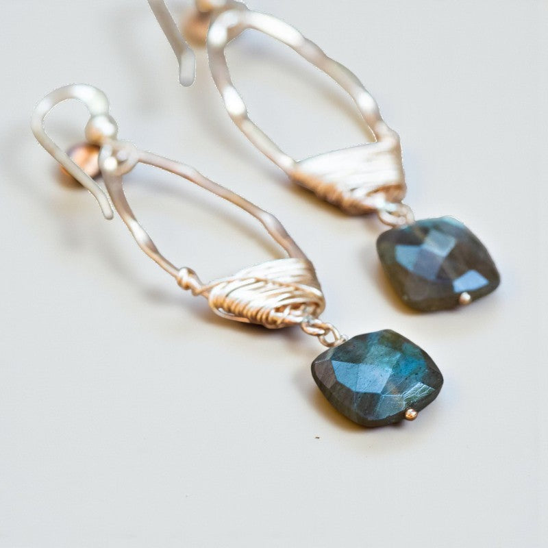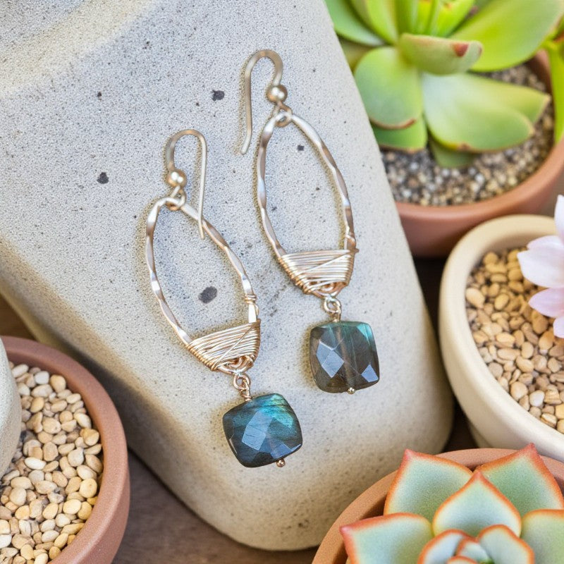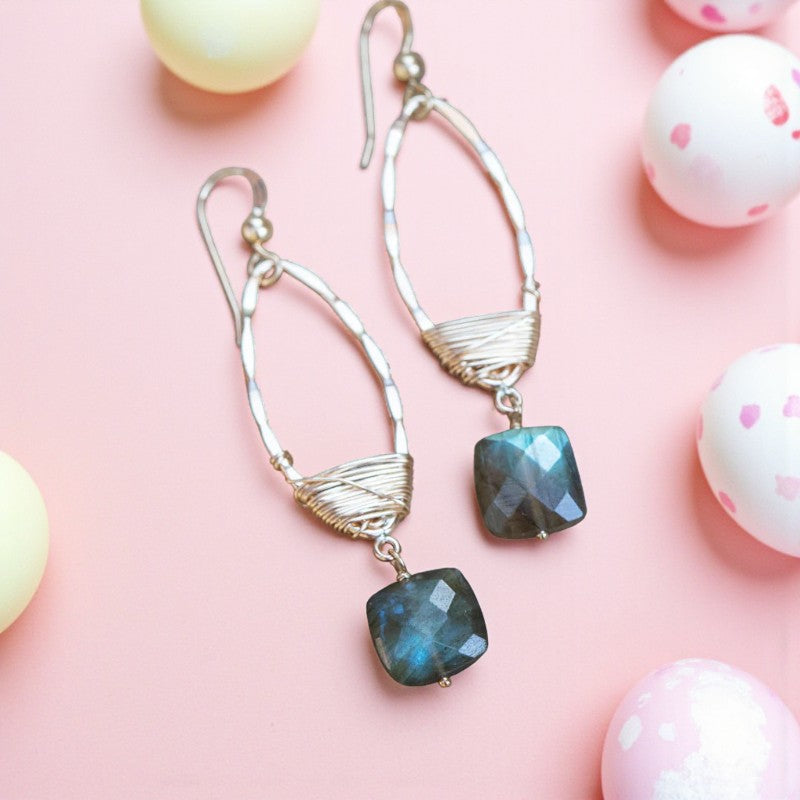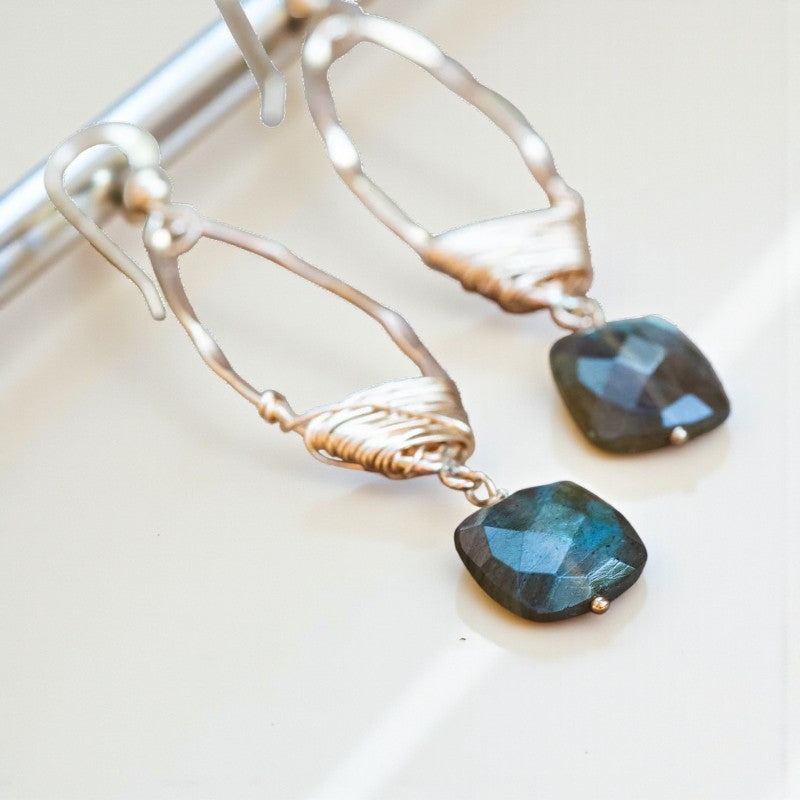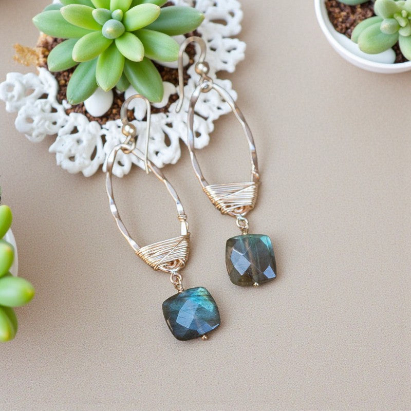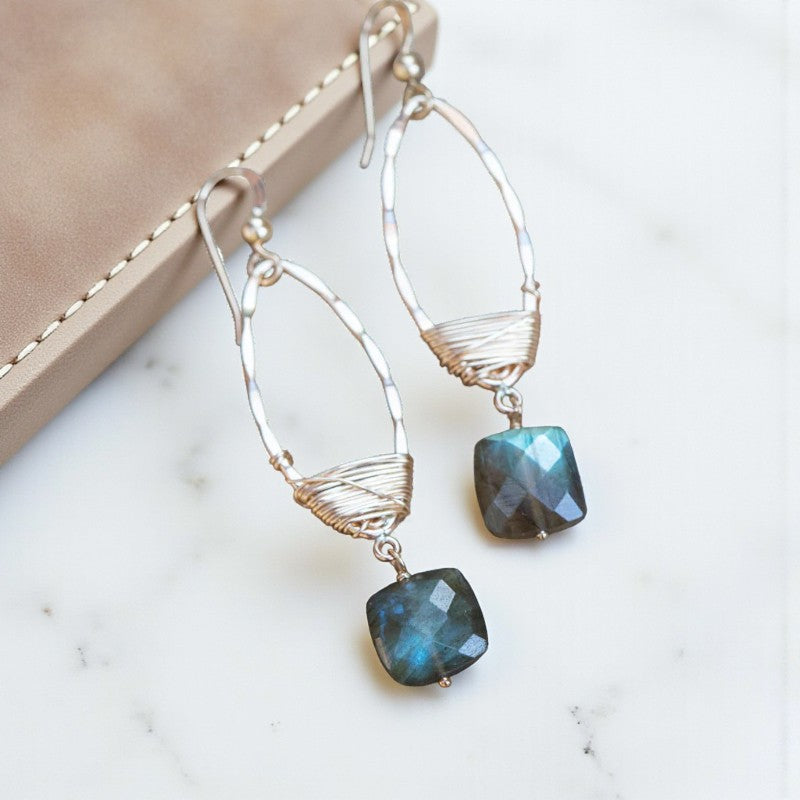 Prepare to be enchanted by these exquisite earrings, featuring faceted cushion-cut square moonstones that radiate with a mesmerizing play of colors, shimmering between hues of milky white, silver, and soft blue as they catch the light. Each stone is meticulously wire-wrapped in sterling silver wire, showcasing a captivating and intricate wrapping technique that underscores the artistry behind the creation. The addition of elegant French hook ear wires brings a touch of timeless sophistication, while the hammered detailing on the earring components infuses a rustic, handcrafted charm into the design.