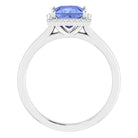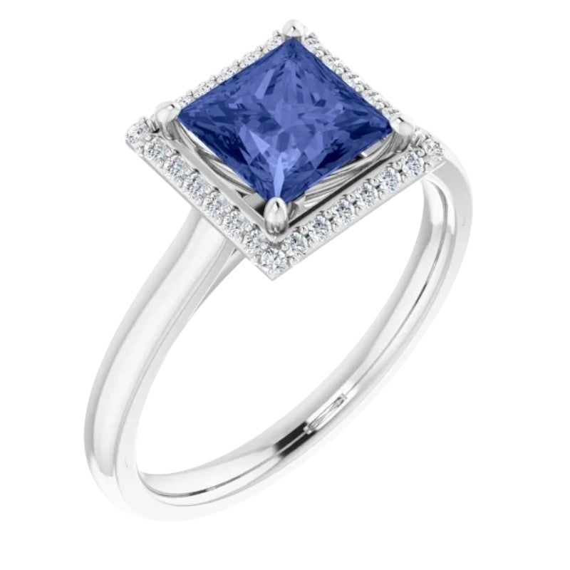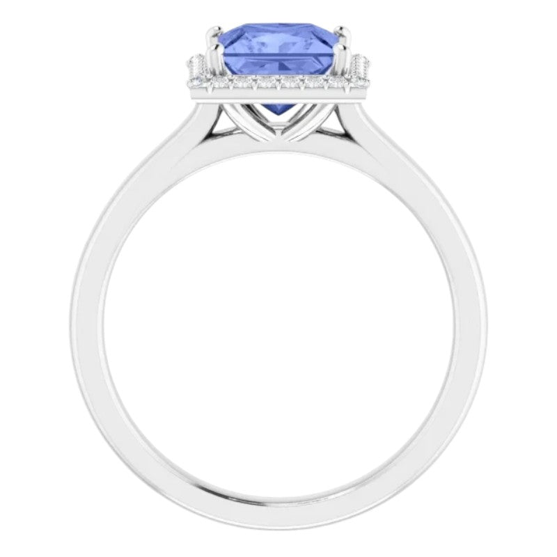 Prepare to be captivated by the enchanting allure of Tanzanite, a gemstone renowned for its mesmerizing deep blue-violet hue. This exquisite ring features a stunning square-cut 6x6 tanzanite, elegantly encircled by 1/10 ct of dazzling diamonds, all delicately set in a lustrous 14k white gold band.