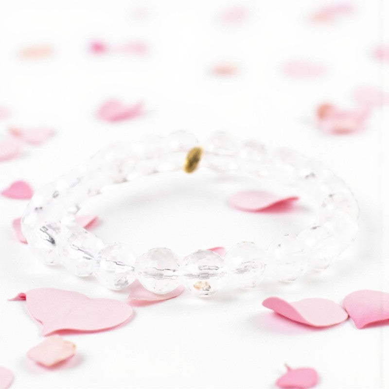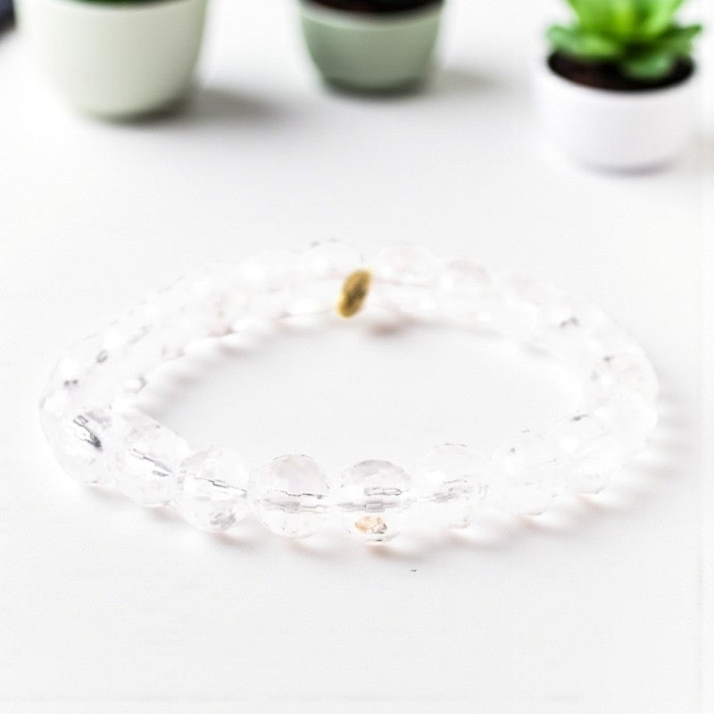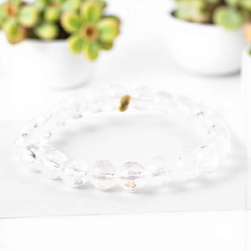 Embrace the transformative energy of the 8mm faceted clear quartz bracelet designed to harmonize and heal your Crown Chakra. Each bracelet is meticulously crafted with clear quartz, known as the "master healer," revered for its ability to magnify intentions, cleanse the soul, and promote overall balance and well-being.