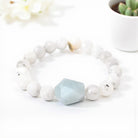 This bracelet features 10mm faceted moonstone beads with a faceted aquamarine center stone, strung on a strong clear elastic cord for durability. Each bracelet is approximately 7 inches in size and comes with an informational card, specifically tagged as "Baby Maker," to guide you on the properties and intentions of the stones.