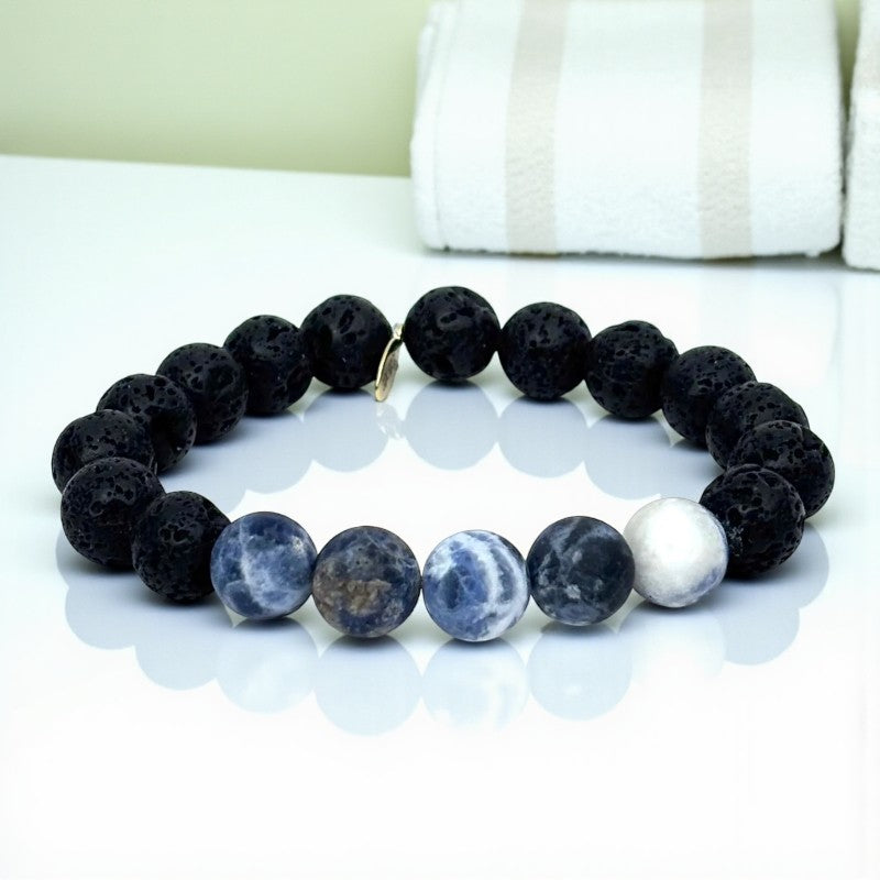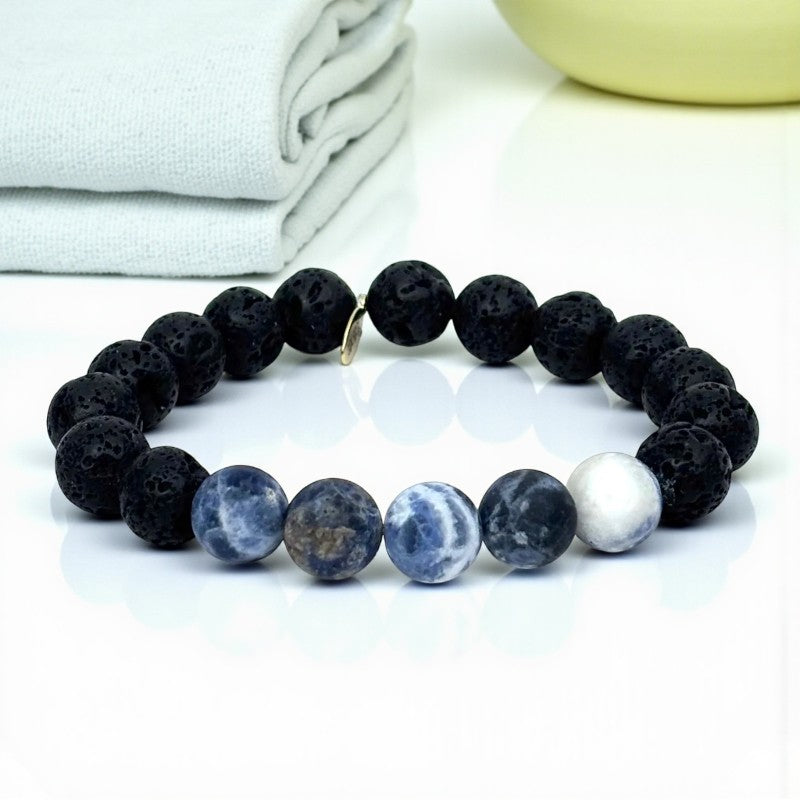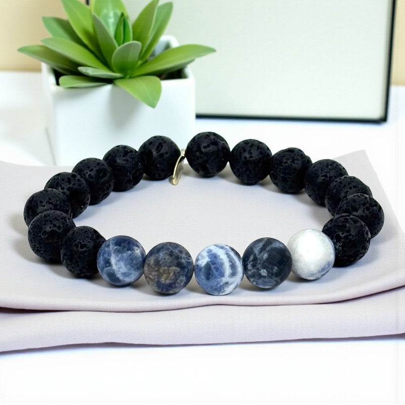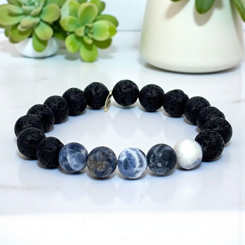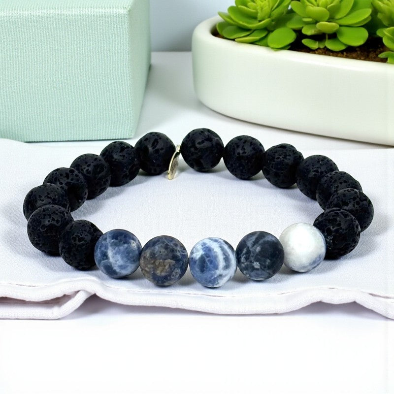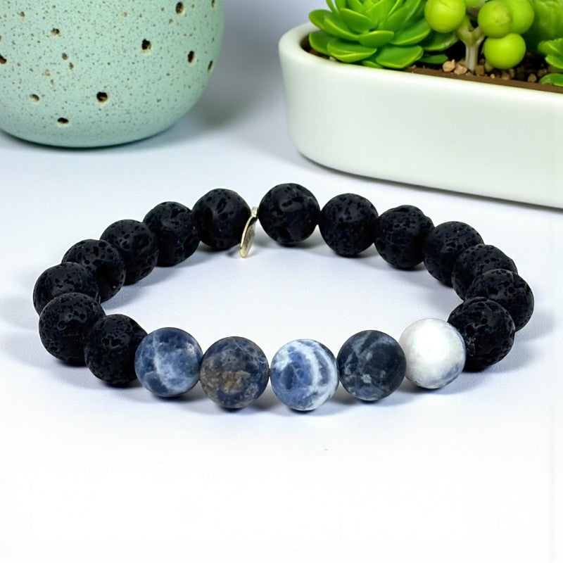Recharge your spirit and find balance with the Sodalite and Lava bracelet, allowing its gentle energies to ground you, enhance your creativity, and promote emotional well-being. Wear it as a reminder of your inner strength and resilience, and let its soothing vibrations guide you towards self-discovery and harmony.