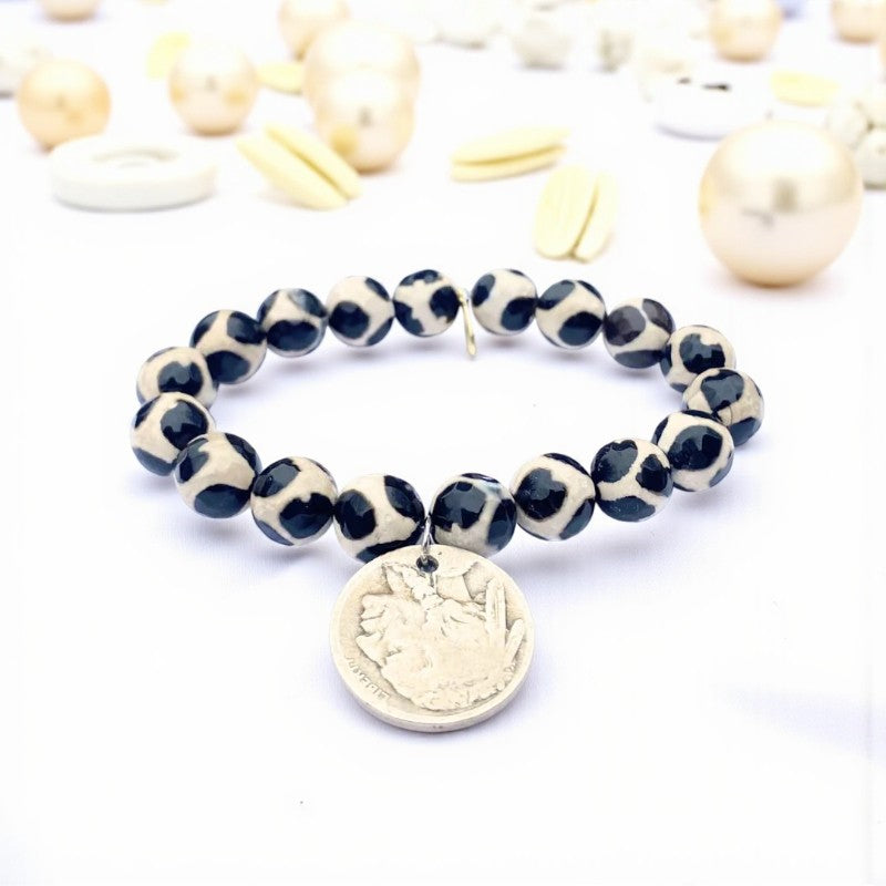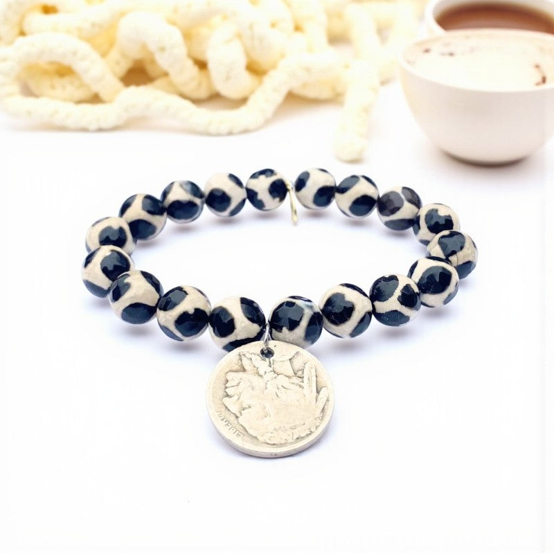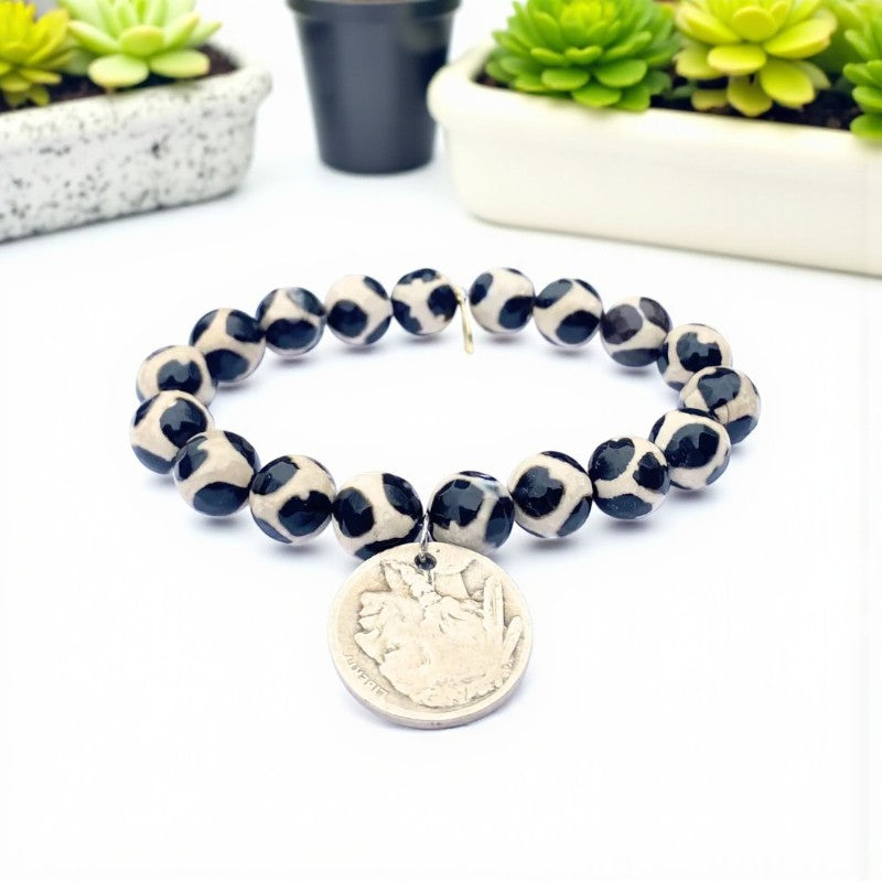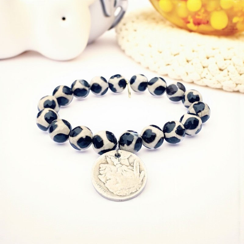 Unlock the nurturing energies of the May birthstone with our Giraffe Agate bracelet, meticulously crafted to inspire love, abundance, and inner harmony. This exquisite bracelet features 10mm giraffe agate beads adorned with a buffalo nickel accent, symbolizing protection, strength, and connection to the natural world.