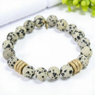 Embrace the healing energies of the Dalmatian Jasper and Brushed Gold Rings Healing Bracelet, allowing the grounding essence of Dalmatian Jasper and the elegance of brushed gold to guide you towards self-care, protection, and inner peace. Wear this bracelet as a reminder to prioritize your well-being and cultivate a sense of tranquility and wisdom in your life.
