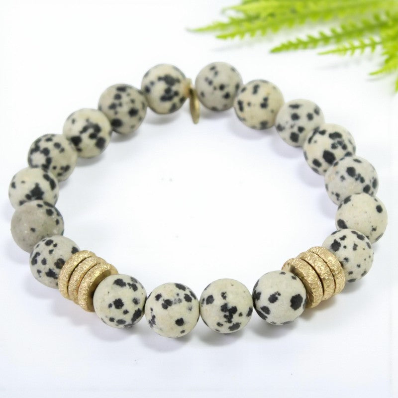 - Features 10mm Dalmatian Jasper beads with six brushed gold rings