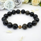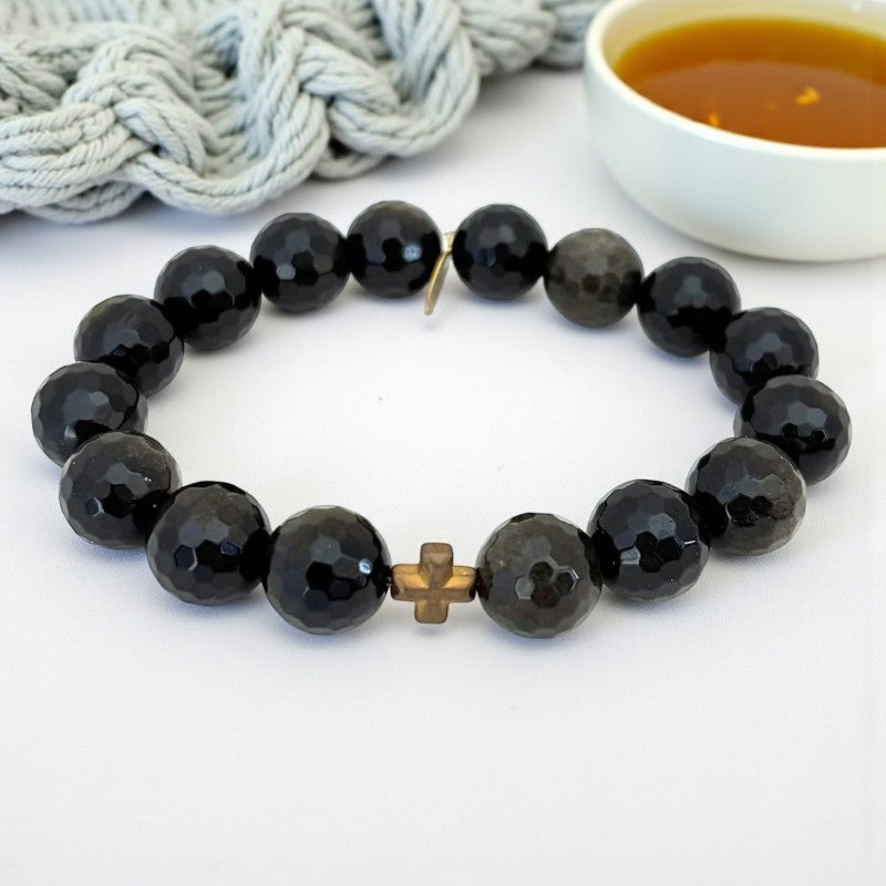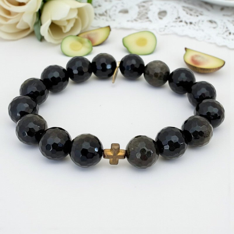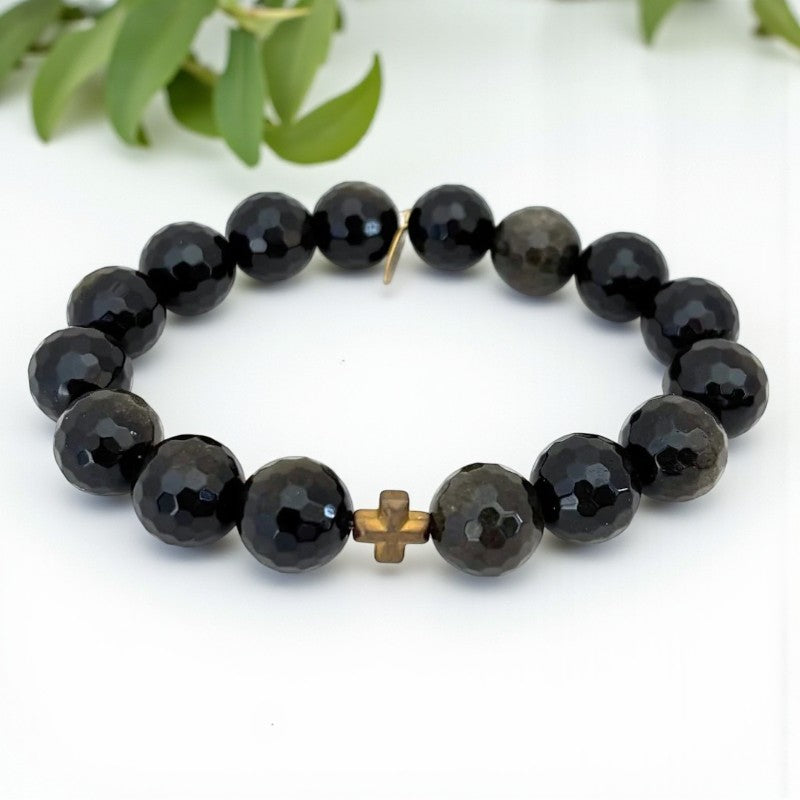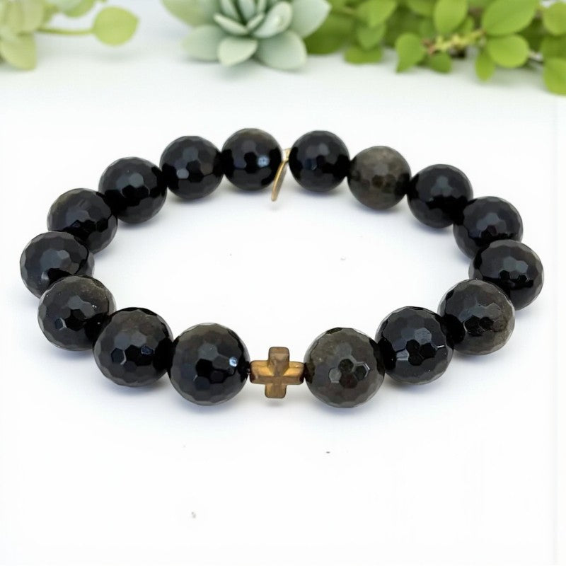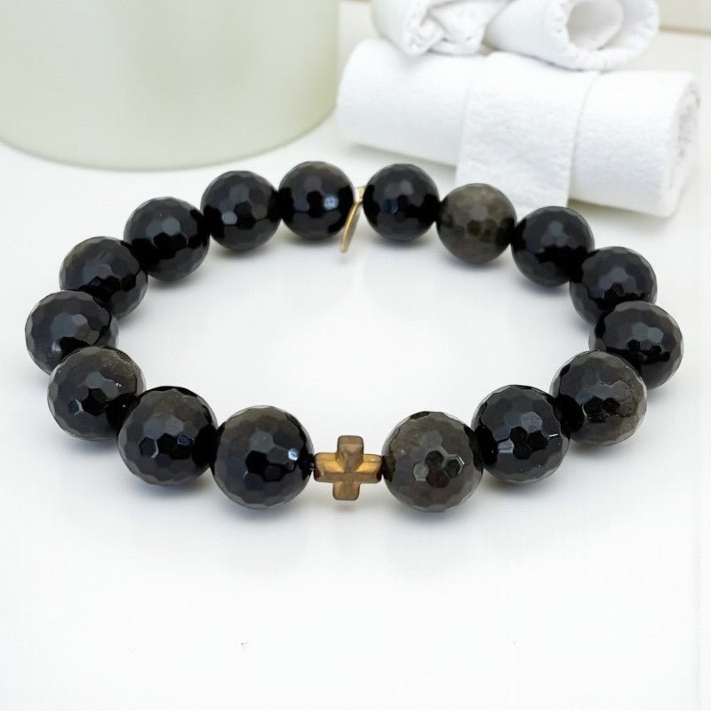 Immerse yourself in the protective energies of the 12mm faceted obsidian bracelet adorned with a brass plus sign, symbolizing positivity and amplification. This listing offers a single bracelet designed to bring transformation, manifestation, and deep emotional clarity into your life.