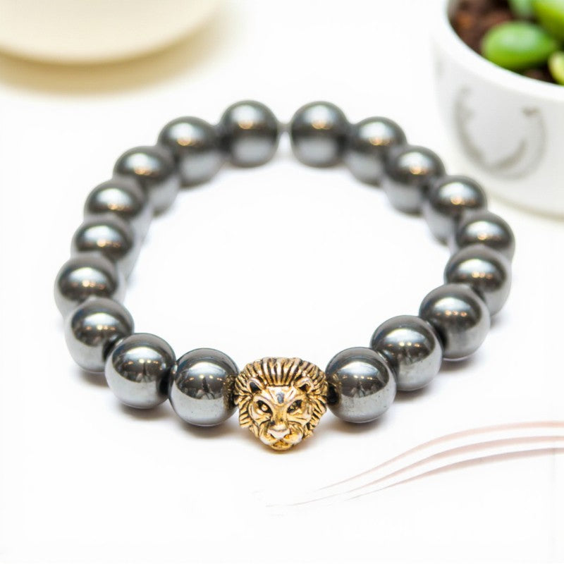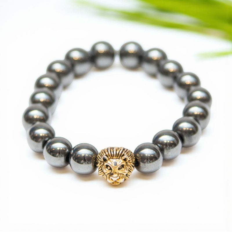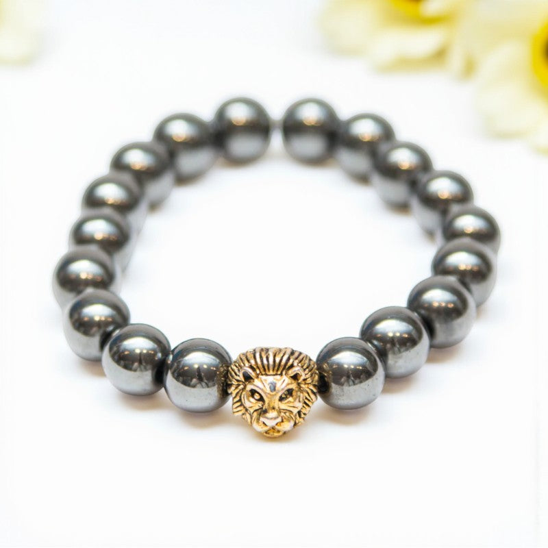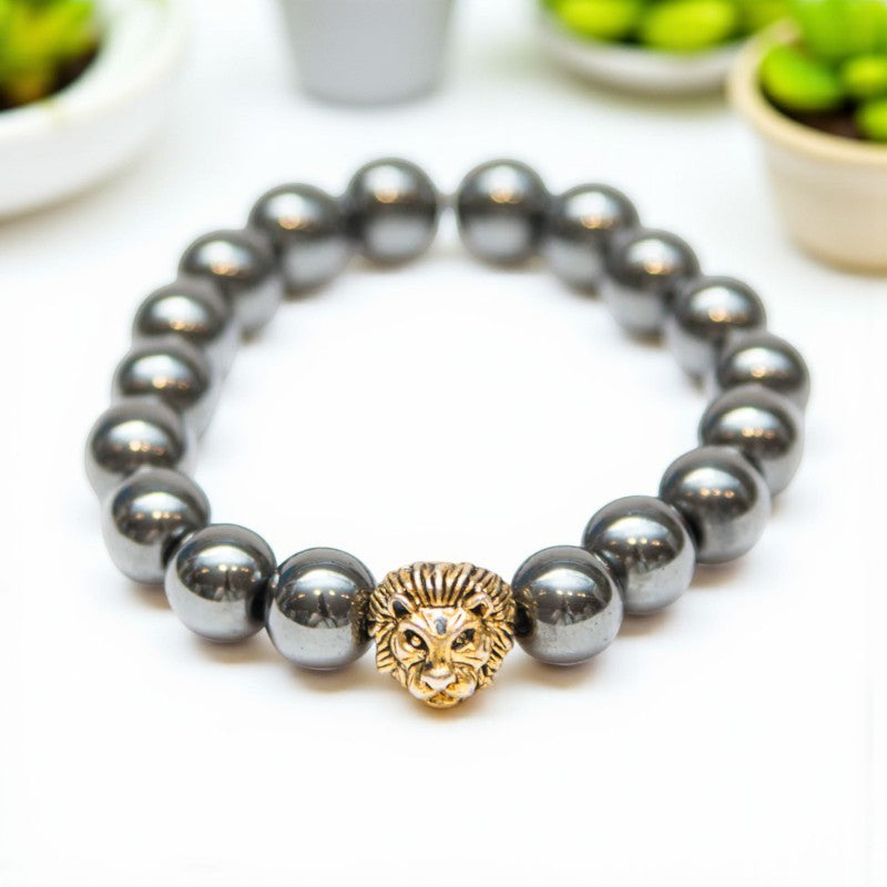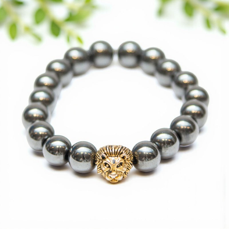 Harness the stabilizing energies of the 10mm gunmetal hematite bracelet adorned with a brass lion head charm, symbolizing strength and courage. This listing offers a single bracelet designed to enhance mental stability, confidence, and overall balance for individuals born under the zodiac signs of Aries and Aquarius.