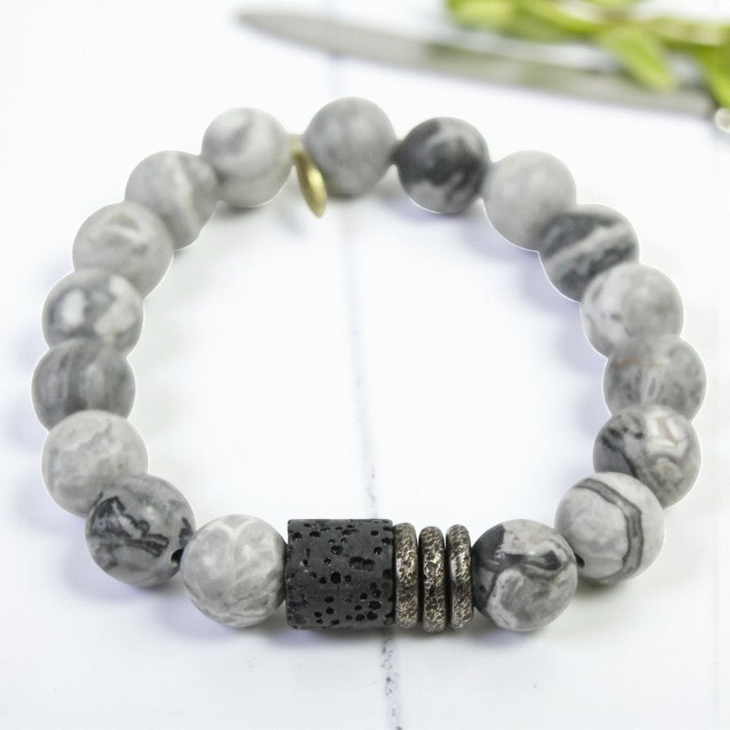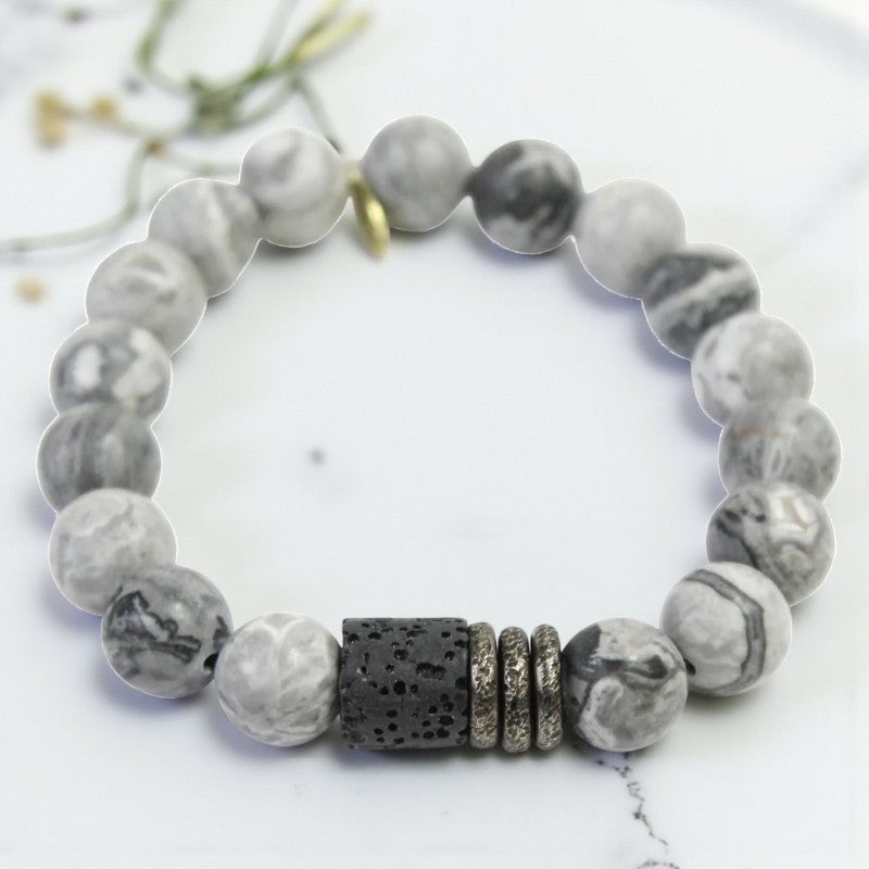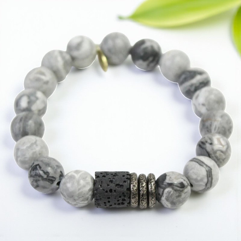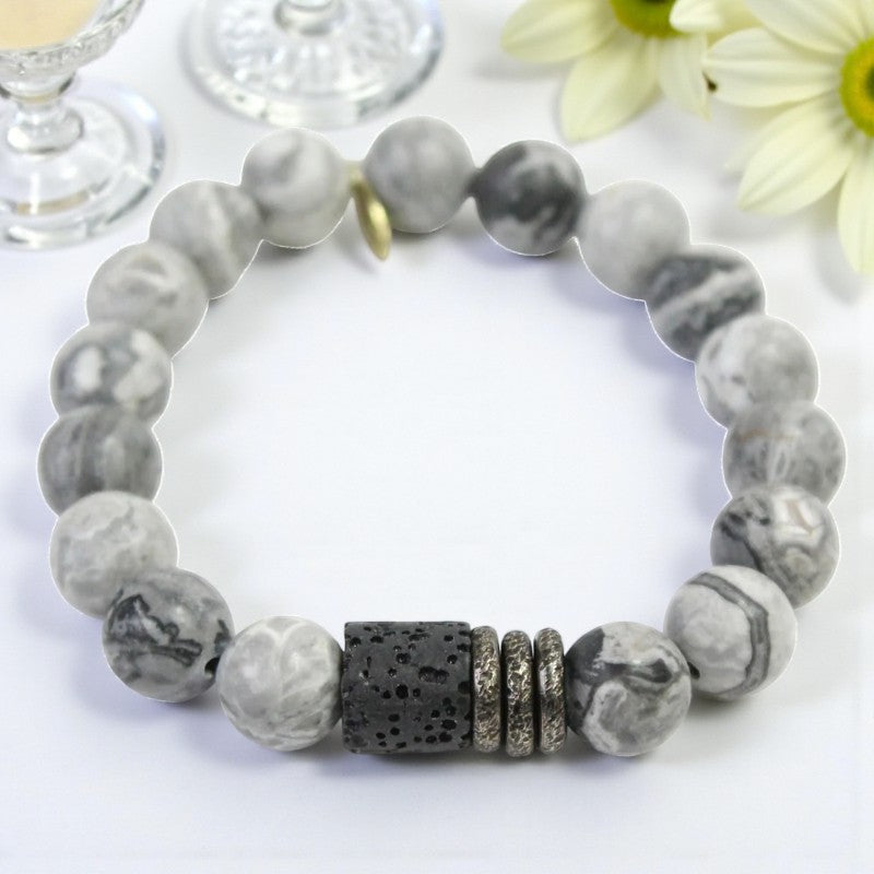 The lava barrel adds grounding energy and vitality to the bracelet, while the gunmetal rings symbolize strength and protection. Together with Gray Jasper, they create a harmonious blend that fosters a peaceful and balanced state of mind.