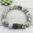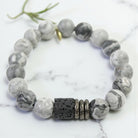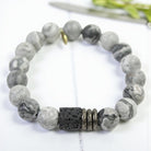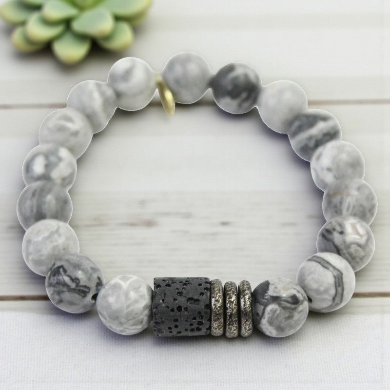 Embrace the healing energies of the Gray Jasper Bracelet with Lava Barrel and Gunmetal Rings, allowing the grounding essence of Gray Jasper and the vitality of lava to guide you towards self-care, protection, and inner peace. Wear this bracelet as a reminder to prioritize your well-being and cultivate a sense of tranquility and wisdom in your life.