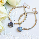 Illuminate your look with these stunning gold earrings, featuring a captivating fusion of moonstone and citrine at the core. The moonstone's ethereal glow casts a spellbinding shimmer of iridescent blues and whites, while the citrine's sunny hues radiate warmth and vitality, creating a harmonious blend of celestial beauty. Encased within the golden setting, these gemstones harmonize to offer a mesmerizing play of light and color, perfect for any occasion, day or night.