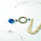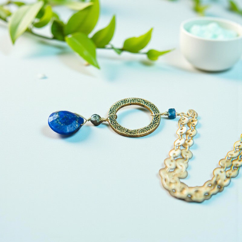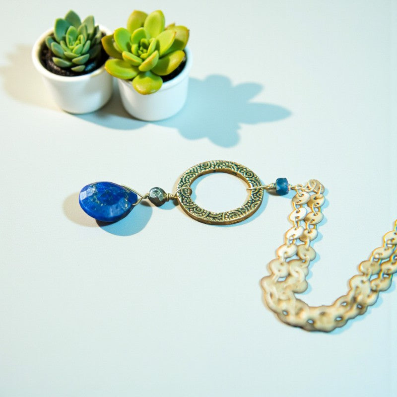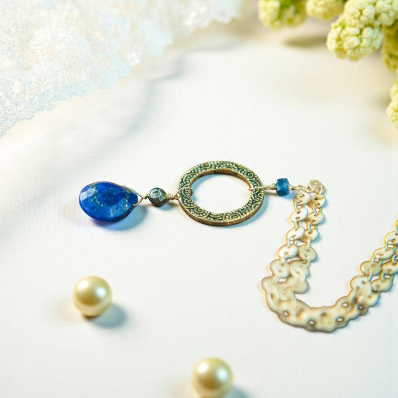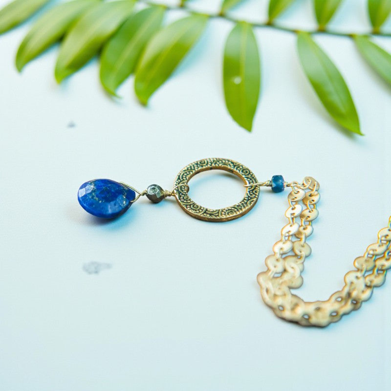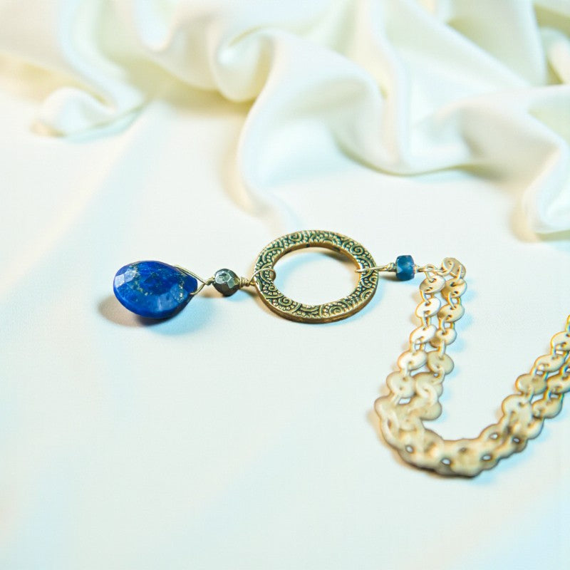 Our signature touch of gold-filled wire delicately intertwines a small round faceted pyrite with the lapis lazuli, enhancing the necklace's allure. A unique gold and black textured circle, adorned with intricate designs, adds a touch of sophistication, culminating in a faceted blue sapphire that elevates the necklace's aesthetic appeal.
