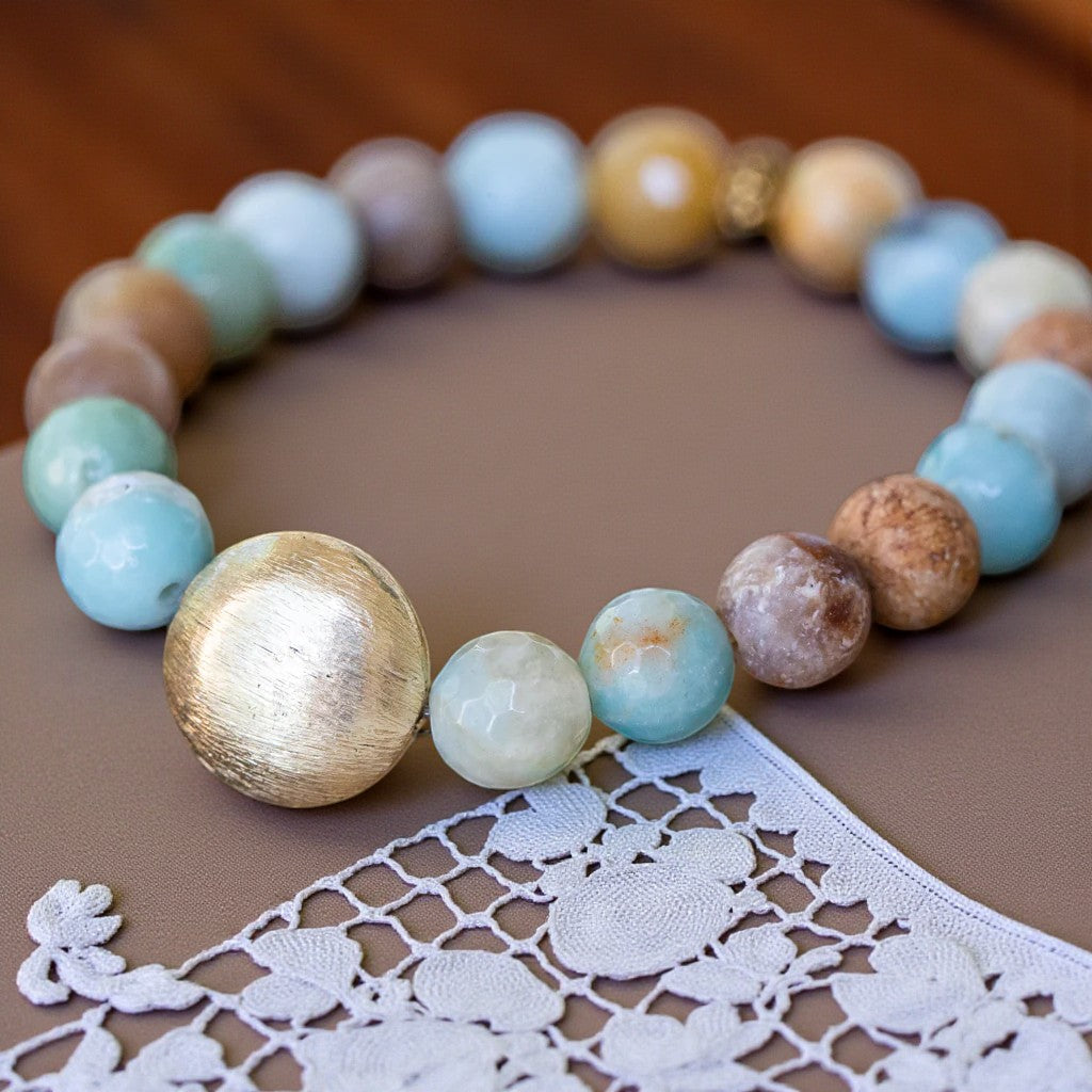 Immerse yourself in the luminous blend of vibrant faceted amazonite, the grounding essence of opalite, and the allure of brushed gold beads. Amazonite, a beacon of peace, truth, and communication, gently calms the spirit with its palpable energies. Emitting soothing blue rays, this stone envelops the heart in rejuvenating vibrations, fostering serenity within.