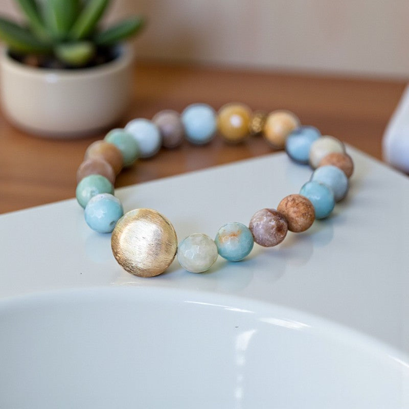 Harmony's Embrace: Amazonite, Opalite, and Brushed Gold Bead Trio Bracelet
