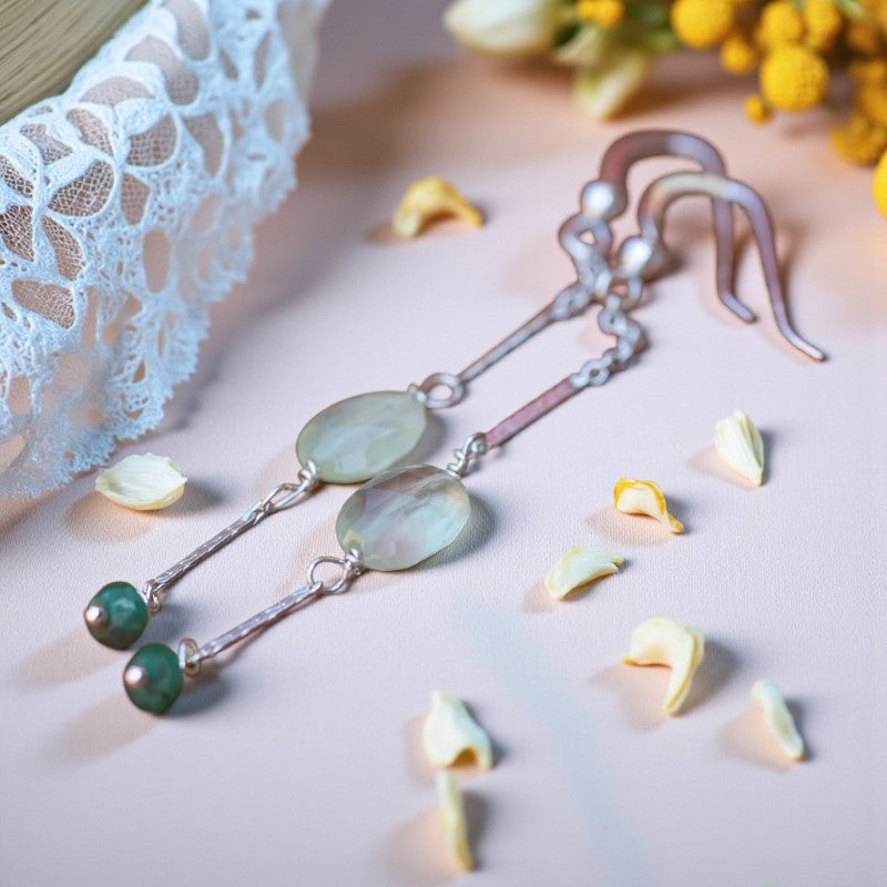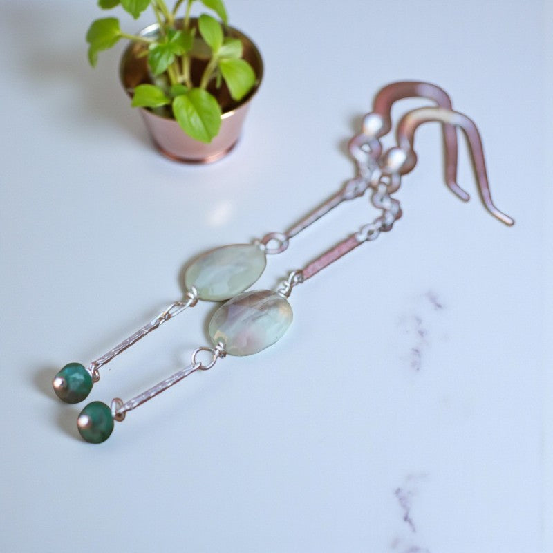 Designed for comfort and ease of wear, these earrings embody the serene and hopeful qualities of the stones they showcase, allowing you to carry a touch of tranquility and grace with you wherever you go. Experience the gentle whispers of serenity as you adorn yourself with these exquisite earrings, a testament to the enduring beauty and healing power of nature's treasures.