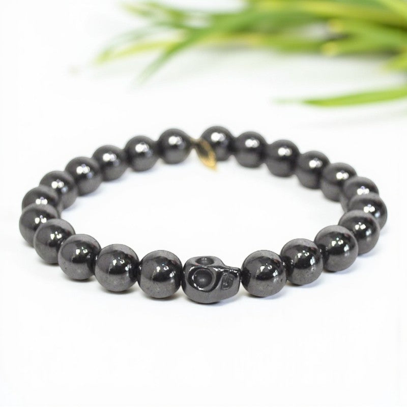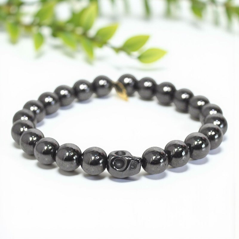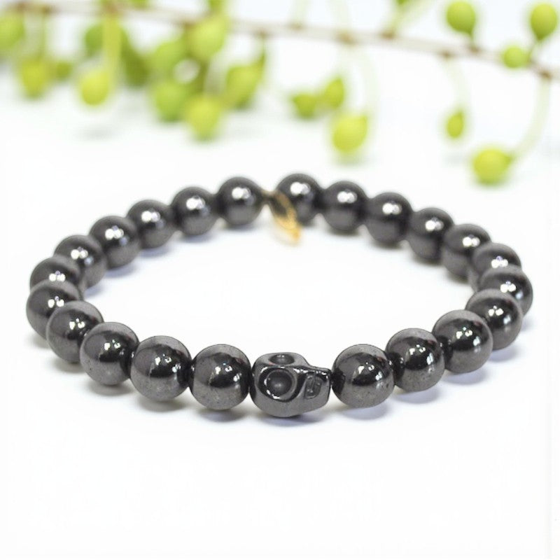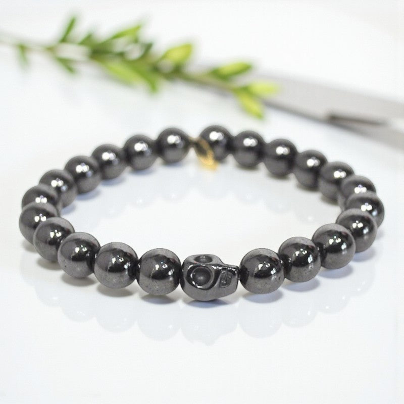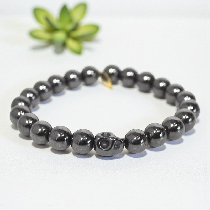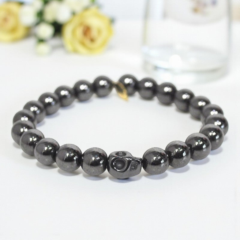 Hematite Crystal Bracelet with 8mm Gunmetal Beads and Skull Accent