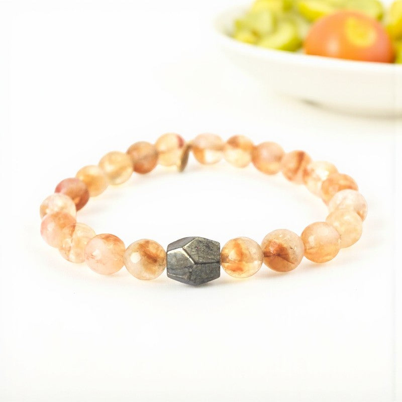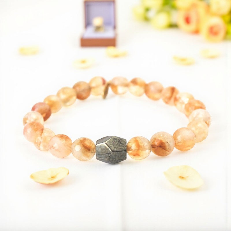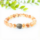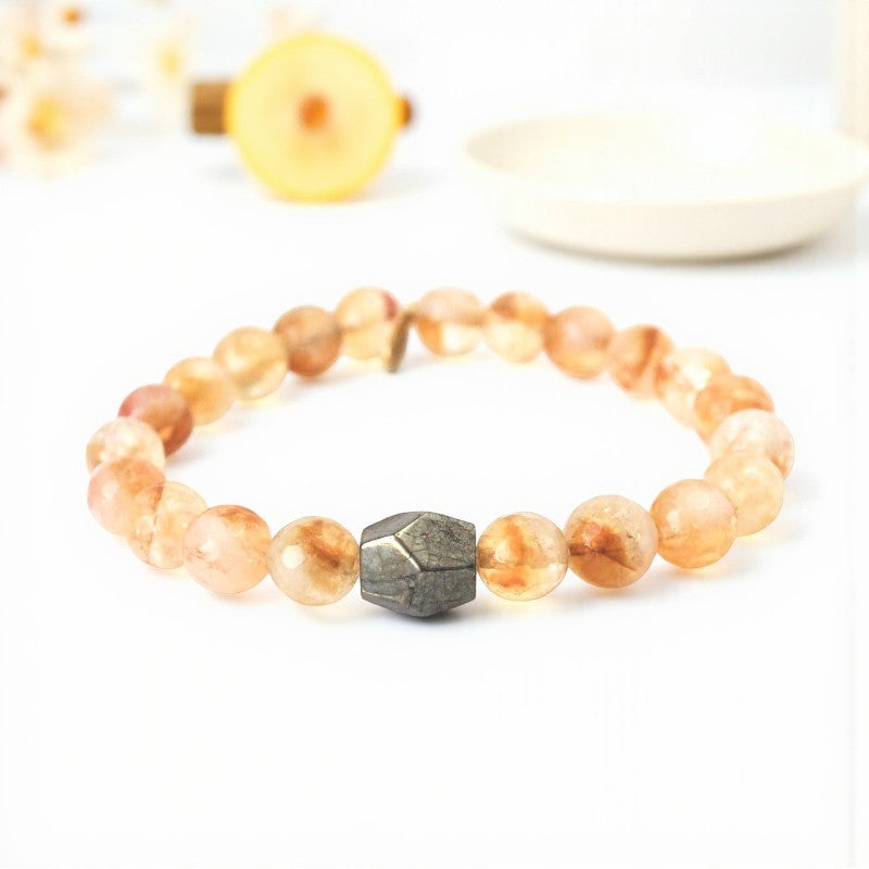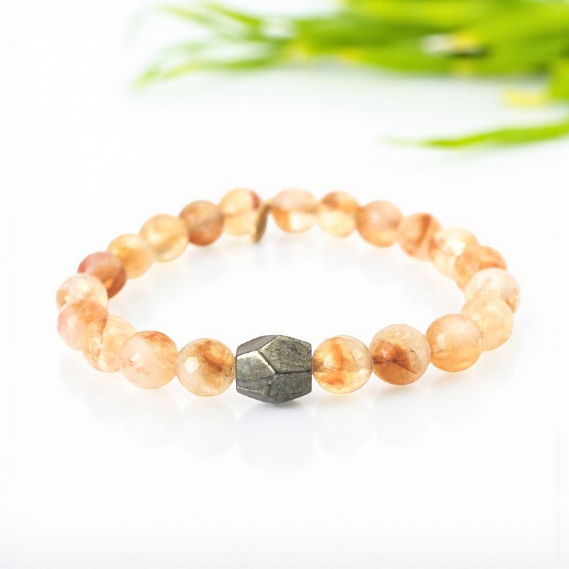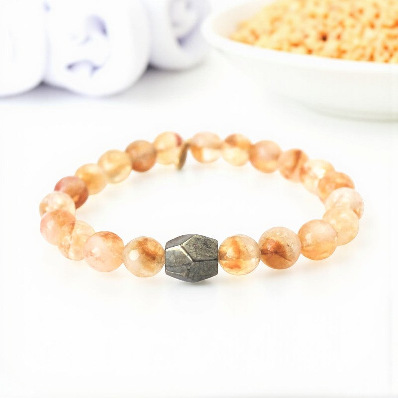 Embrace happiness, prosperity, and inner strength with the exquisite 8mm faceted honey bee citrine bracelet, featuring a striking pyrite center stone. This bracelet is specially designed for individuals born under the zodiac signs of Aries, Gemini, Leo, and Libra, resonating with the sacral, crown, and solar plexus chakras to promote balance and well-being.