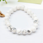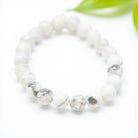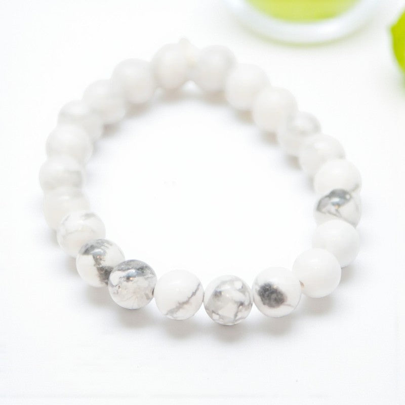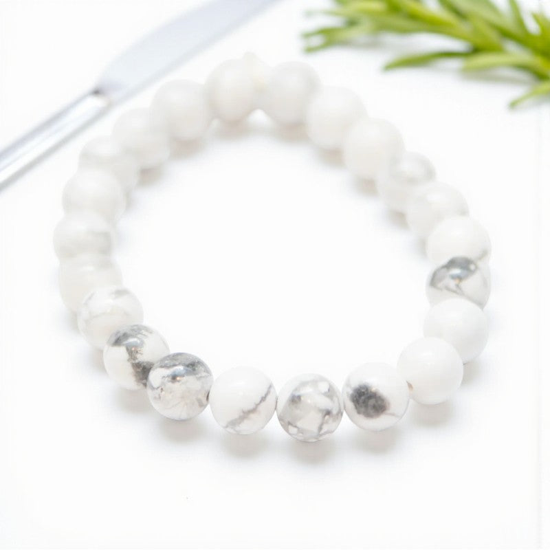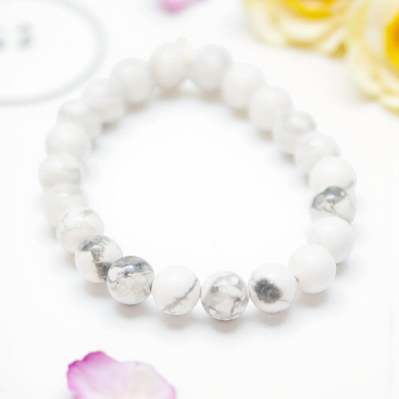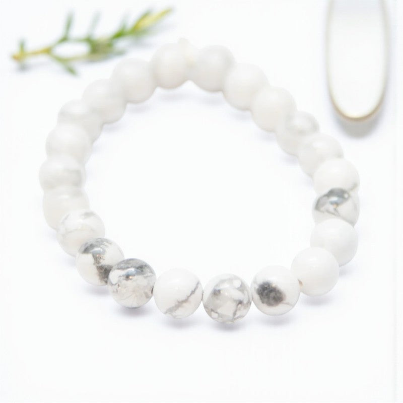 This exquisite bracelet features 8mm polished Howlite beads, exuding a sense of purity and tranquility. Each bead is carefully selected to enhance the overall aesthetic appeal and energetic resonance of the bracelet. Strung on a resilient clear elastic cord, this bracelet is designed for comfort and durability, ensuring a perfect fit for daily wear.