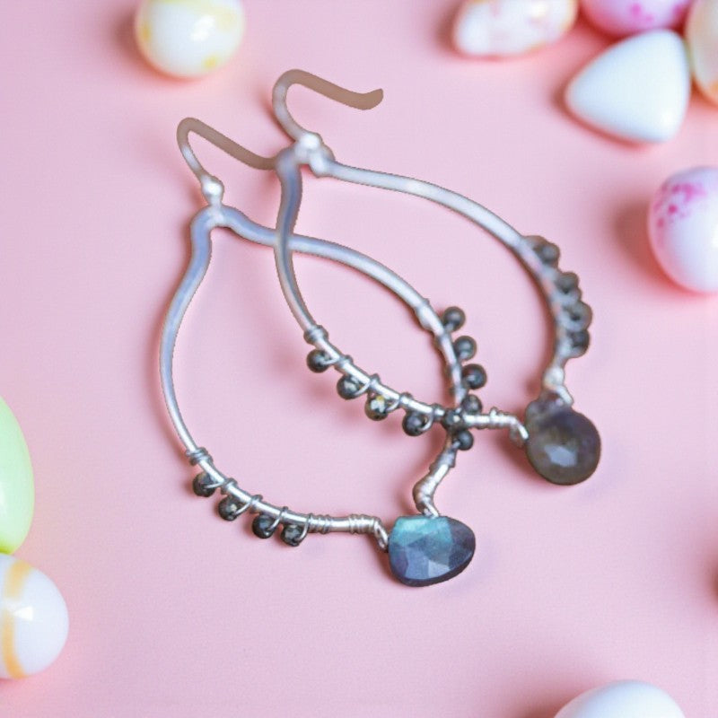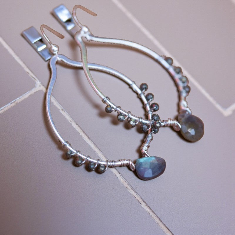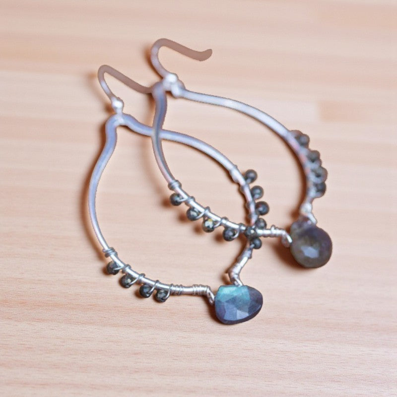 These enchanting labradorite earrings offer a touch of radiance to elevate both your daytime and evening ensembles. The faceted gemstone reveals a mesmerizing interplay of blue, green, and tan hues, shimmering elegantly as it catches the light. Complemented by faceted pyrite side gems and crafted with sterling silver wire, this design strikes a perfect balance between lightweight comfort and impactful style, boasting an open oval point that exudes sophistication in a compact form. If you're a labradorite enthusiast, these earrings hold the key to unlocking the stone's hidden treasures.